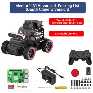 O Hiwonder MentorPi A1 é um robô educacional avançado, projetado para aprendizado e desenvolvimento em inteligência artificial, robótica e sistemas embarcados. Equipado com o controlador Raspberry Pi 5, este kit oferece uma plataforma robusta e versátil para aplicações educacionais e de pesquisa. O MentorPi A1 integra um Lidar TOF, uma câmera 3D, um chassi com rodas Ackermann, servomotores de alto torque e suporte a modelos de linguagem como o ChatGPT, proporcionando uma experiência imersiva em mapeamento, navegação e interação sensorial.