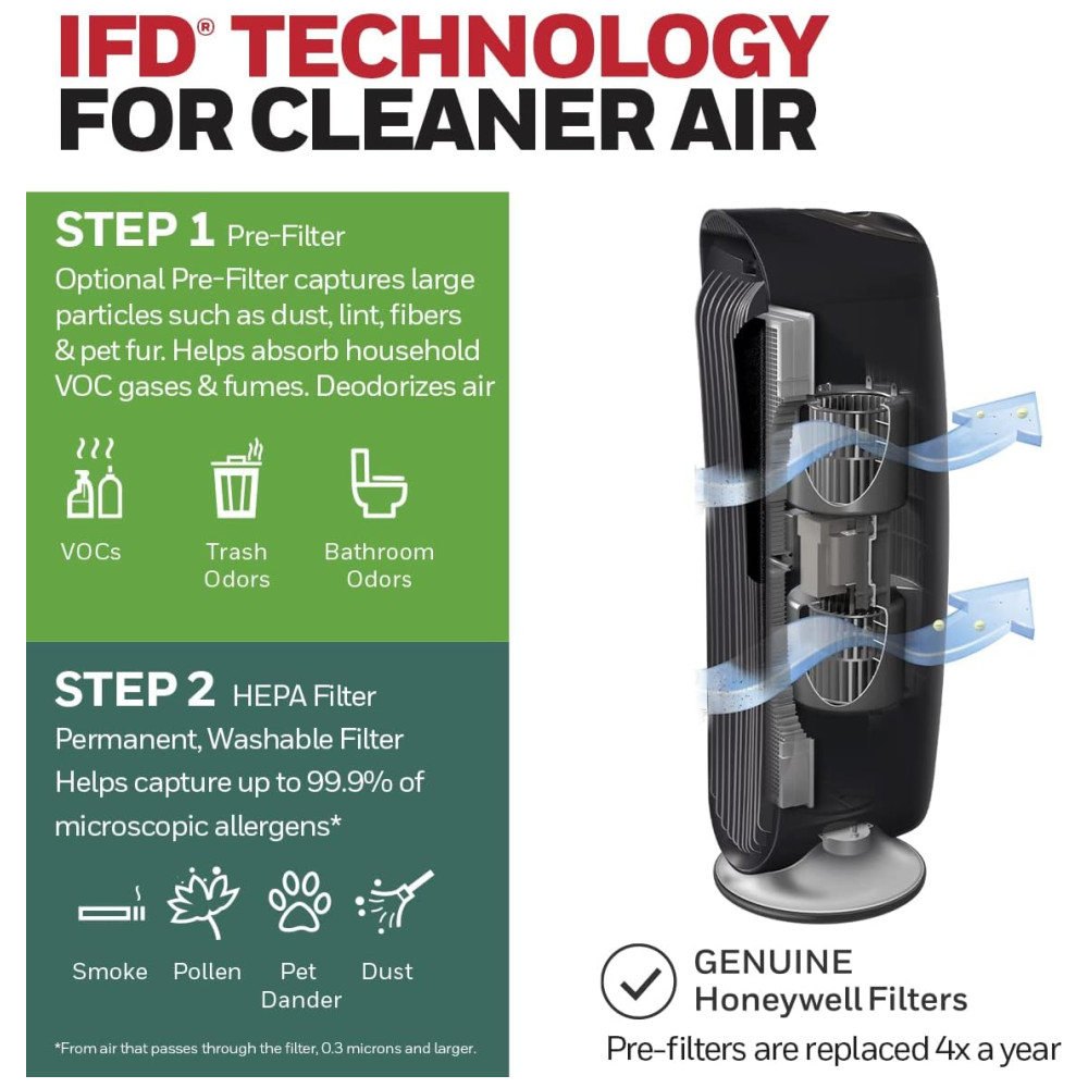OSCILLATING AIR PURIFIER This air purifier circulates air helps capture up to 99 of airborne particles as small as 2 microns such as smoke, dust, pollen, and pet dander from the air that passes through the filter. PERMANENT FILTERS This tower air purifier features 3 cleaning levels, on, off oscillation control washable permanent pre filter Clean filter. Its Energy Star certified for energy efficiency. HONEYWELL QUALITY REPLACEMENT FILTERS The included filter helps reduce odors and VOCs. Each air purifiers performance is tested as a system with the filters for best efficiency. FILTER CIRCULATE Honeywell Air Purifiers filter circulate air in the stated room size up to 5 times an hour. Breathe easy knowing the air in your home is fresher cleaner with fewer allergens. HONEYWELL QUALITY Improve your air quality neutralize odors for a clean healthy breathing experience year round with Honeywell replacement filters for air cleaners purifiers.