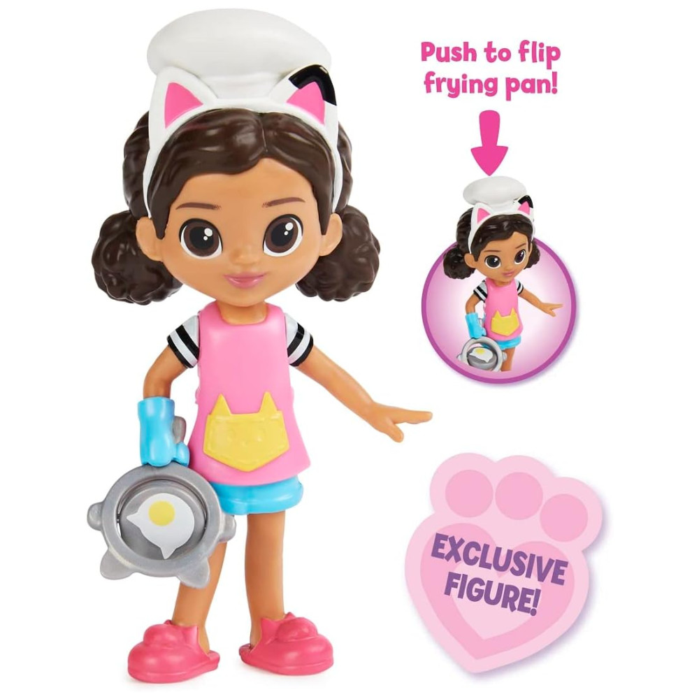 BONECA COM RECURSO DE AÇÃO Pressione as orelhas de gato da figura colecionável Gabby Girl, para virar a frigideira em sua mão, para se divertir cozinhando e para ajudá la a ser criativa na cozinha.