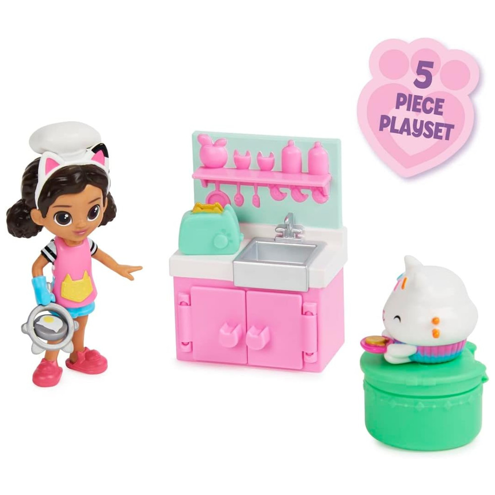 Inclui 1 Gabby Figure, 1 Cakey Cat Figure, 1 Mobília, 1 Dollhouse Delivery, 1 Accessory
