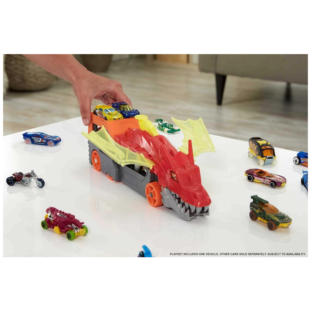 Hot Wheels City Conjunto de Pista de Carrinhos Transportador de Lançamento do Dragão Veículo Escala 1:64 Lançamento de Carros pela Boca da Criatura