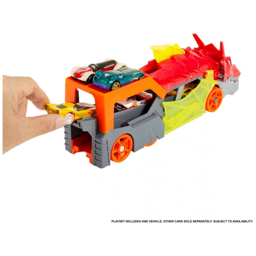 O Transportador de Lançamento do Dragão Hot Wheels City entrega muita diversão com recursos super legais que as crianças vão adorar. Ao invés de lançar chamas pela boca, este dragão estiloso lança carros Hot Wheels! As crianças carregam três carros nele, e ao acionar o lançador, os veículos saem em alta velocidade para diferentes aventuras. Conectores de pista na frente e atrás da fera permitem às crianças acoplar pistas Hot Wheels, para complementar uma construção existente ou iniciar uma nova. Este transportador vem com um carro Hot Wheels, mas pode armazenar até cinco carros adicionais vendidos separadamente. Não compatível com todos os carrinhos Hot Wheels. Cores e decorações podem variar. Dragões normais cospem fogo, mas o Dragão Hot Wheels City cospe carros Hot Wheels pela boca, proporcionando diversão incrível e muita emoção. O transportador do dragão pode armazenar até 5 carros na escala 1:64 e vem com 1 veículo Hot Wheels para diversão imediata. Carros adicionais vendidos separadamente. Conectores de pista na frente e atrás do dragão permitem conexões fáceis com pistas, para que as crianças possam entrar e sair em alta velocidade para aventuras ininterruptas. O transportador do dragão incentiva a exploração independente e inspira a criatividade através de uma emocionante brincadeira. O Transportador do Dragão Hot Wheels City é um ótimo presente para crianças a partir de 3 anos de idade e mais.