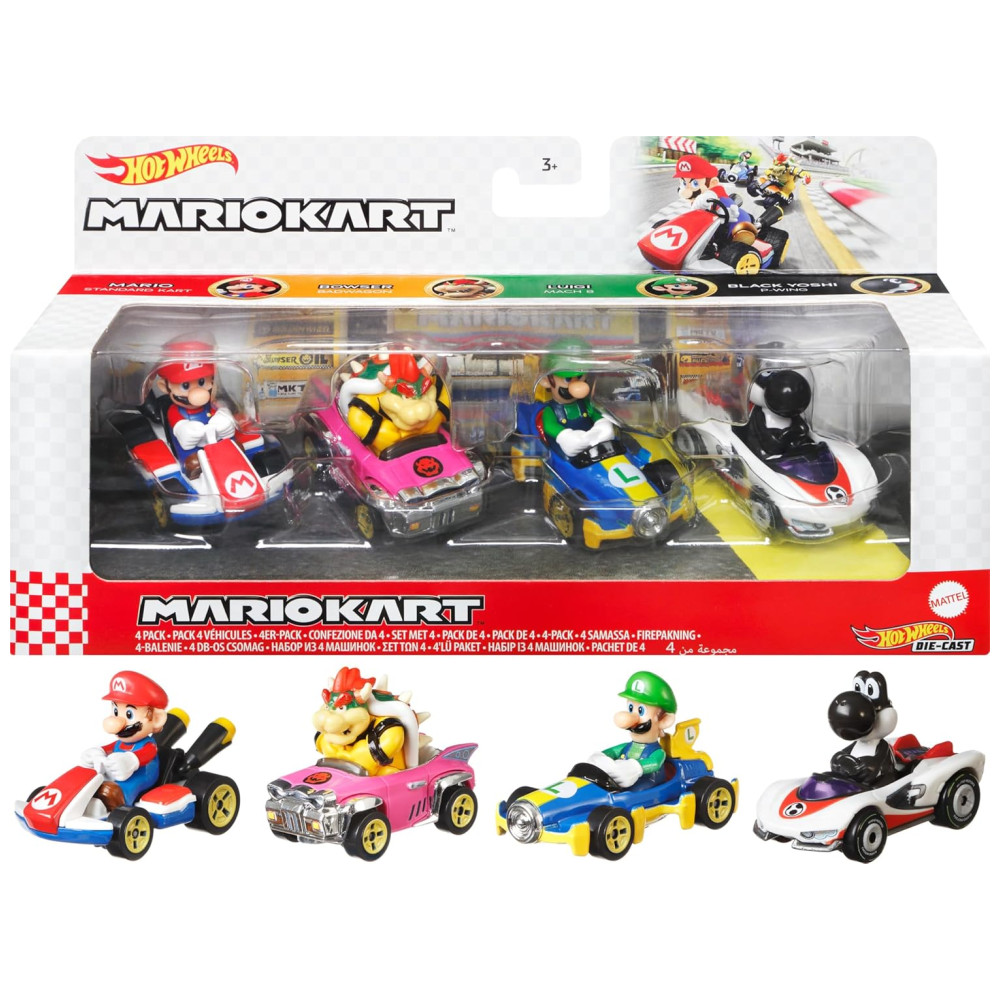 Componentes incluídos: Quatro réplicas die-cast de veículos Mario Kart em escala 1:64. Inclui Mario, Luigi, Bowser e Black Yoshi.