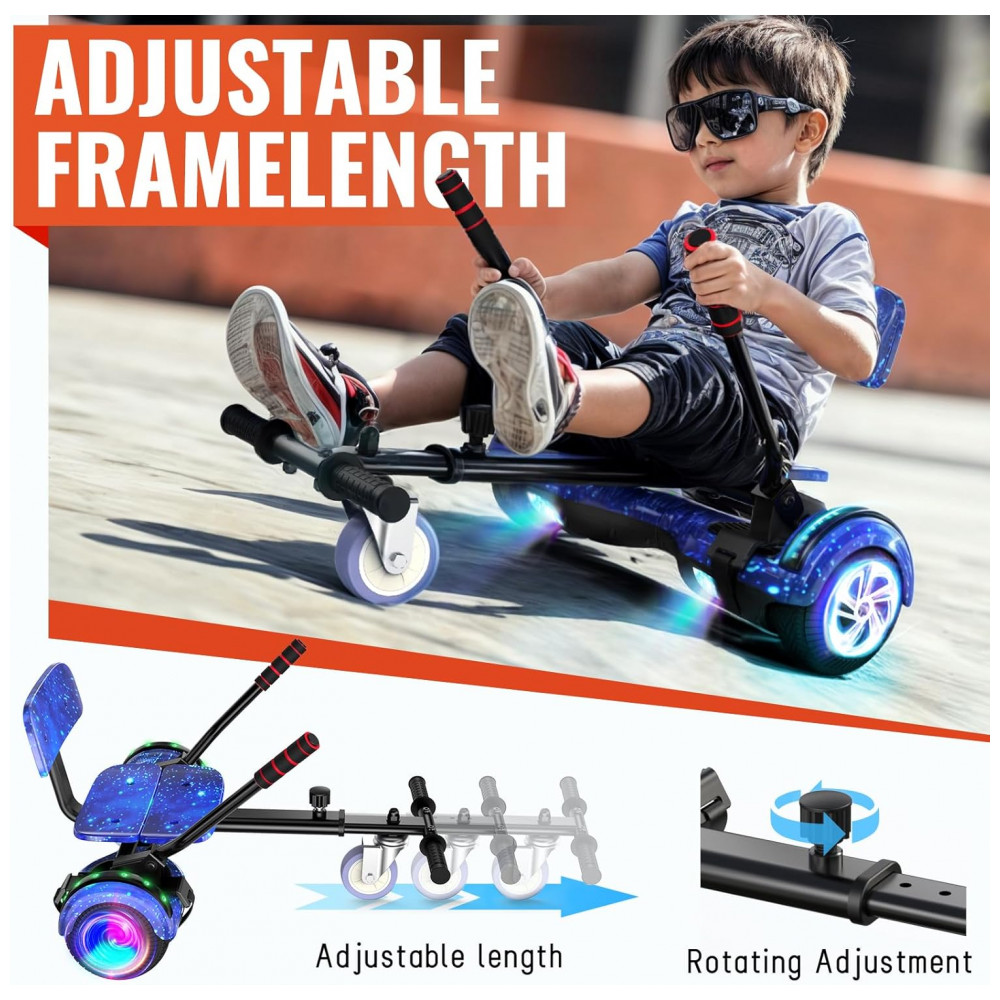 Transforme seu hoverboard em um kart divertido e confortável. O assento expansível proporciona maior agilidade e velocidade, com comprimento ajustável de 72 cm a 85 cm, ideal para crianças e adultos.