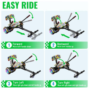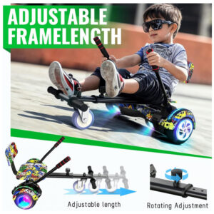 Transforme o hoverboard em um kart seguro e divertido. O assento expansível proporciona maior agilidade e conforto, com comprimento ajustável de 72 cm a 85 cm, ideal para crianças e adultos.