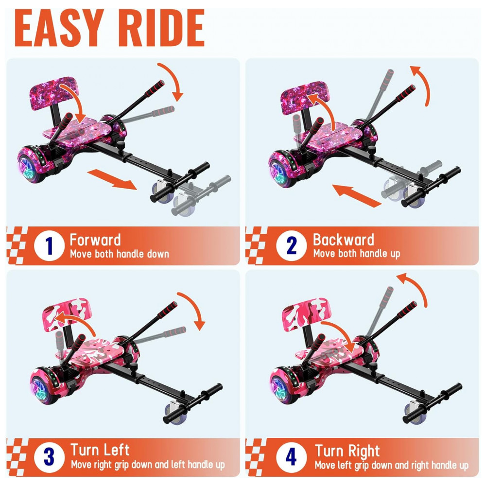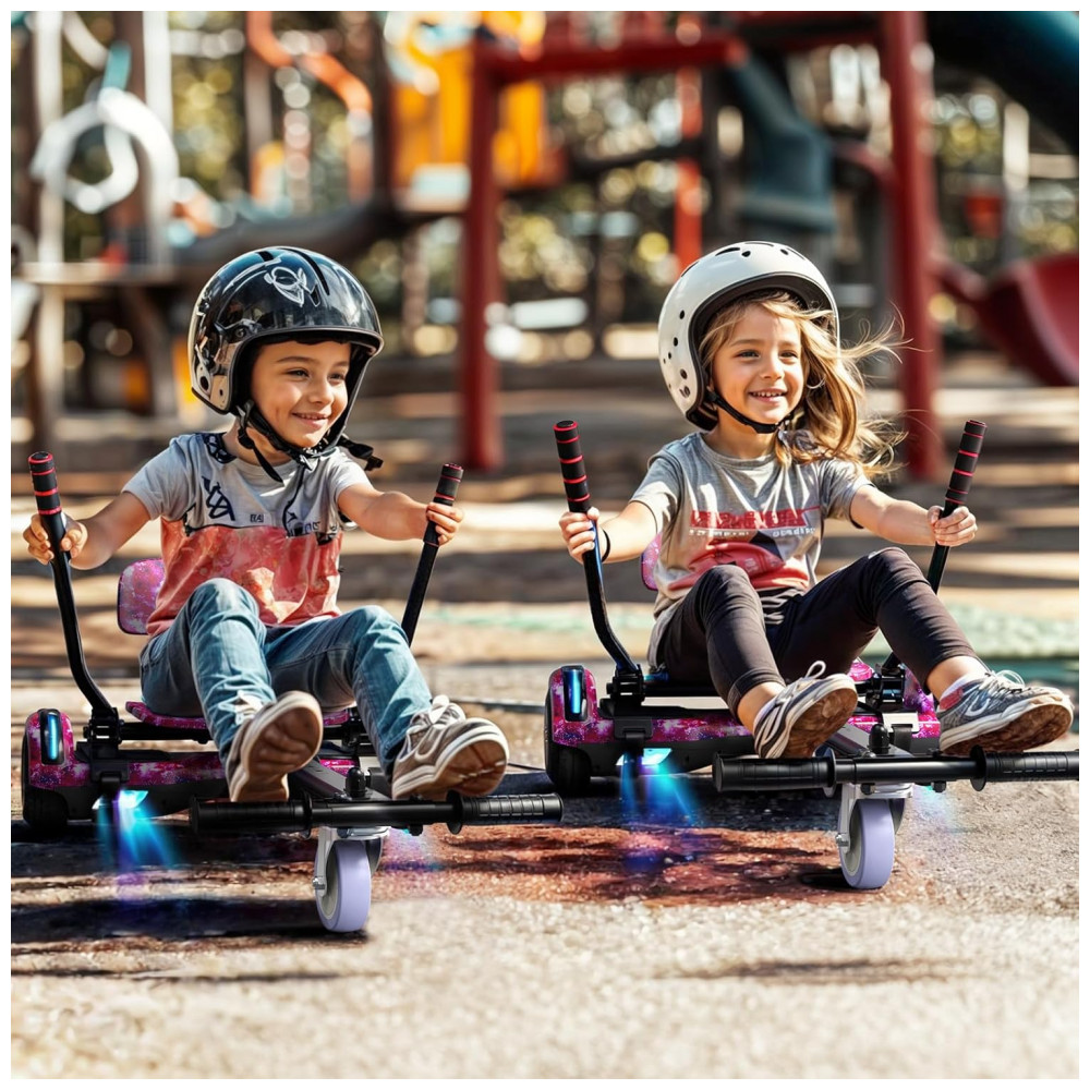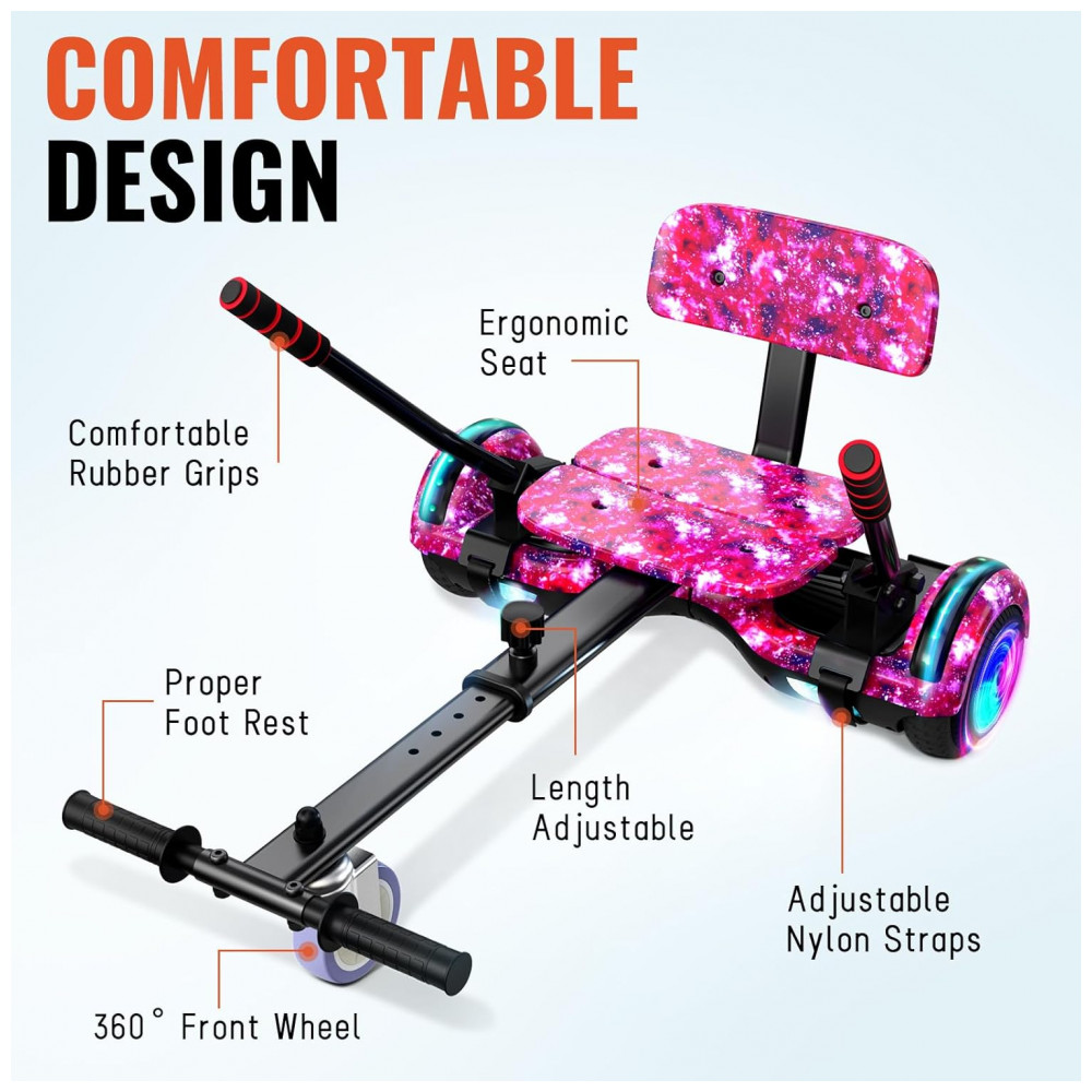 Transforme o hoverboard em um kart seguro e confortável. O assento expansível proporciona conforto e agilidade, com comprimento ajustável de 72 cm a 85 cm, adequado para crianças e adultos, aumentando a diversão e a praticidade do uso.