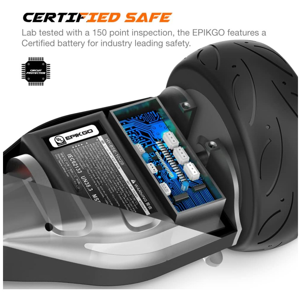 A Placa de equilíbrio GO SAFER EPIKGO possui uma bateria inteligente LG integrada e foi testada por um laboratório credenciado ISO17025 para atender ao padrão UL2272. Foi aprovada em 159 testes de segurança, o que significa que não há riscos potenciais de incêndio. Com motores duplos de 400 W, é capaz de subir encostas íngremes de até 30 graus e percorrer mais de 19 quilômetros com uma única carga, tornando o uma das pranchas mais potentes do mercado.
