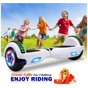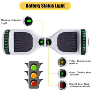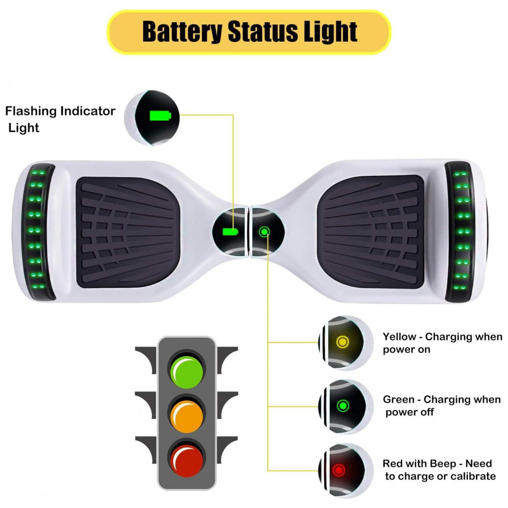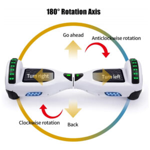 Este hoverboard branco é um scooter elétrico autoequilibrado, ideal para quem busca mobilidade urbana com estilo e segurança. Equipado com motor de 350W, permite atingir até 16 km/h de velocidade máxima, e sua bateria de íon de lítio 36V 4Ah oferece autonomia de até 16 km, suficiente para trajetos urbanos ou lazer. Possui rodas de 6,5 polegadas (16,5 cm) que garantem boa estabilidade em superfícies planas.
