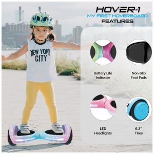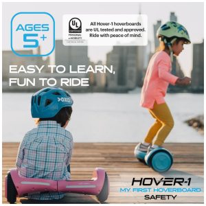 CONDUÇÃO FÁCIL DE HOVERBOARD PARA CRIANÇAS Os motores duplos de 150 W do meu primeiro Hoverboard impulsionam no a uma velocidade máxima segura de 8 km, h e permitem que o hoverboard suba inclinações de até 5 graus. O sistema de estabilização dinâmica por inércia manterá a prancha equilibrada enquanto seu filho se inclina para frente e para trás para montá la. Os pés antiderrapantes proporcionam bastante aderência.