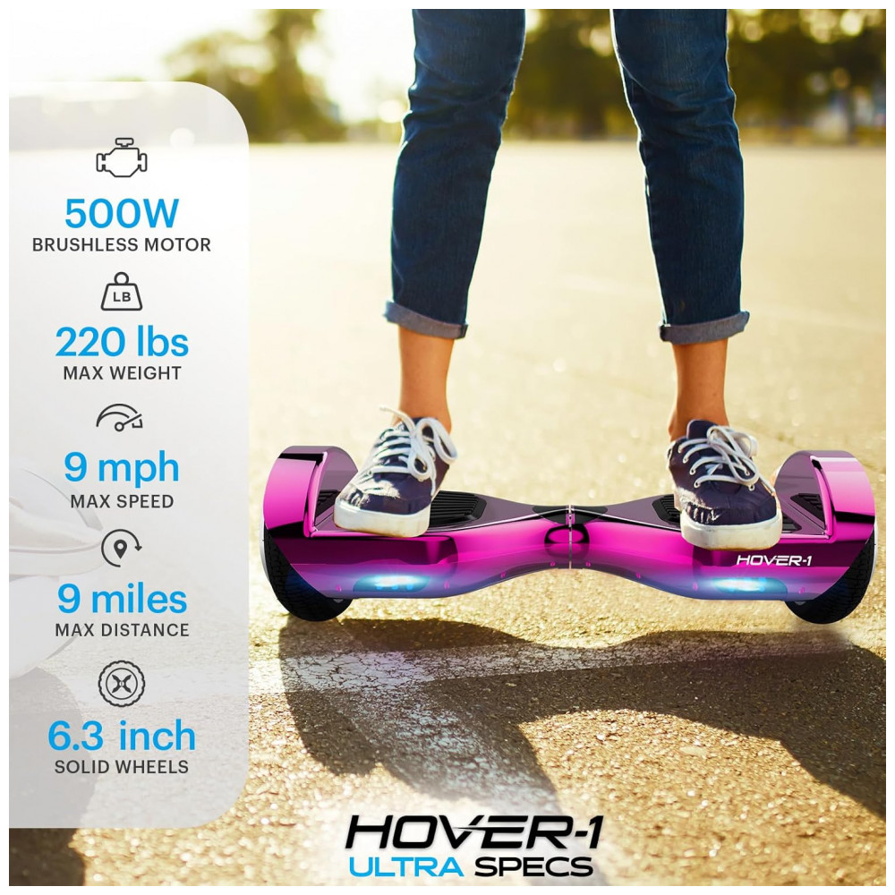 O Hoverboard Hover-1 Ultra é um skate elétrico autossegurável, equipado com dois motores de 250 W cada (totalizando 500 W), oferecendo potência e controle para seu usuário. Possui velocidade máxima de 16 km/h (aproximadamente 10 mph) e autonomia de até 19 km por carga com sua bateria de íon de lítio de 36 V e 4 Ah, proporcionando passeios prolongados. As rodas sólidas de 16,5 cm garantem estabilidade e resistência contra furos, sendo ideais para superfícies planas urbanas.