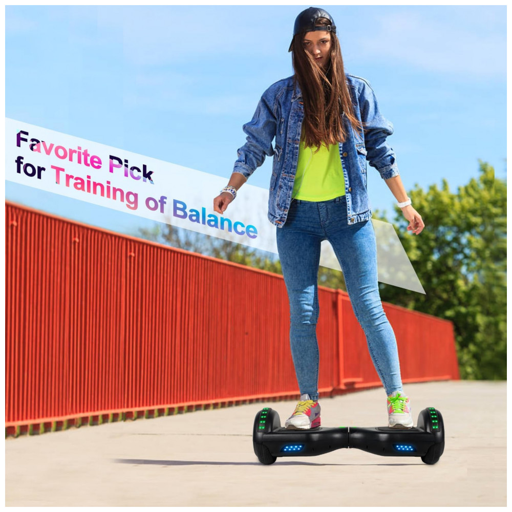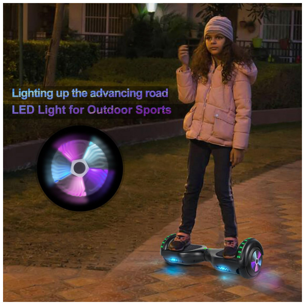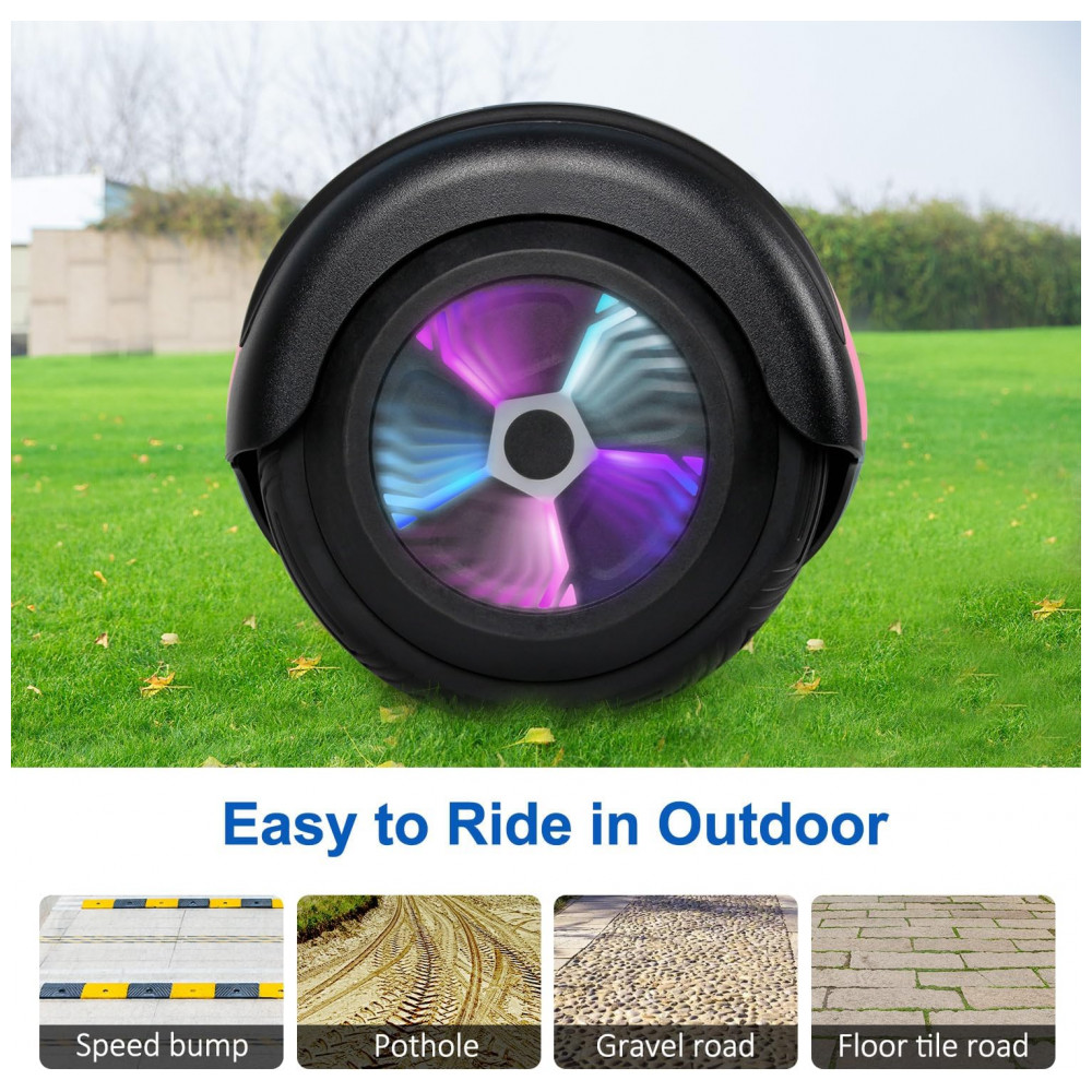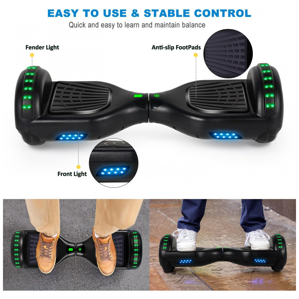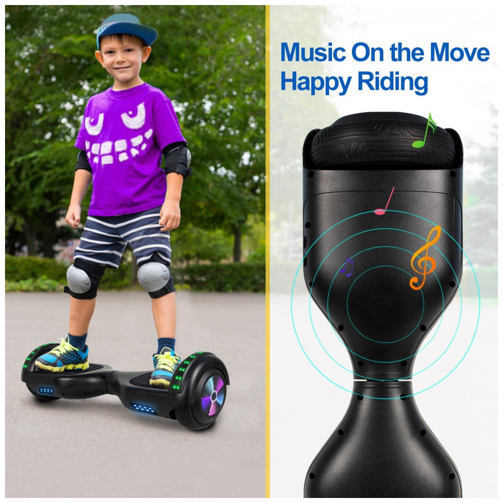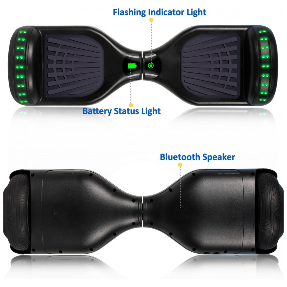 O hoverboard conta com conexão Bluetooth para reprodução de música via alto-falante integrado, além de luzes LED coloridas frontais e nas rodas que incrementam a segurança e o estilo durante o uso em ambientes de pouca luz. Certificado pelo padrão SGS UL2272 de segurança elétrica e de bateria, garante tranquilidade ao usuário.