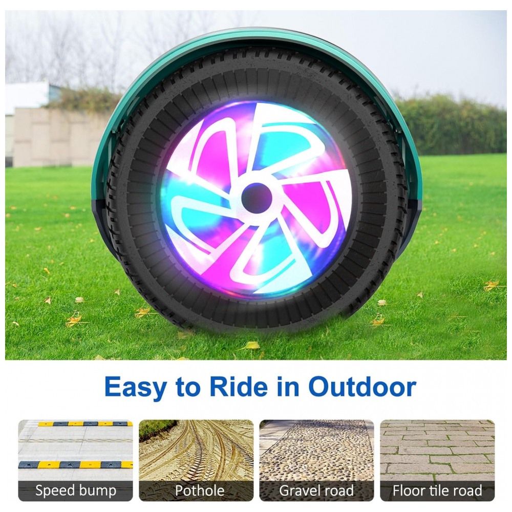 As rodas de 6,5 polegadas (16,5 cm) proporcionam estabilidade em diferentes superfícies, enquanto as luzes LED coloridas aumentam a segurança e o apelo visual, especialmente em ambientes com pouca luz. O aparelho também conta com conexão Bluetooth integrada para reprodução de música durante o uso.