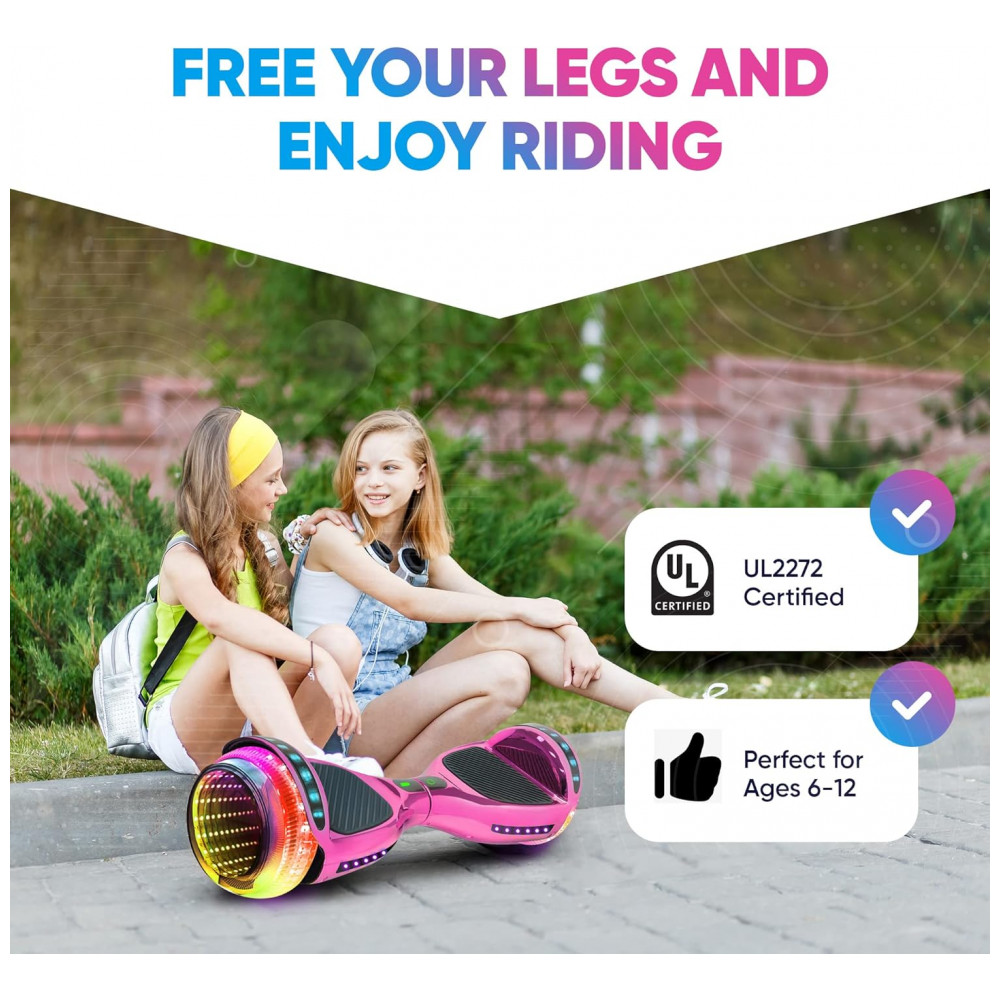 O hoverboard Emaxusa Rosa combina estilo, segurança e diversão para crianças de 6 a 12 anos. Suas rodas estilo túnel totalmente LED proporcionam um show de luzes deslumbrante durante o passeio, aumentando tanto o visual quanto a segurança. Certificado de segurança UL2272, atende aos mais altos padrões de segurança elétrica, bateria e carregamento.