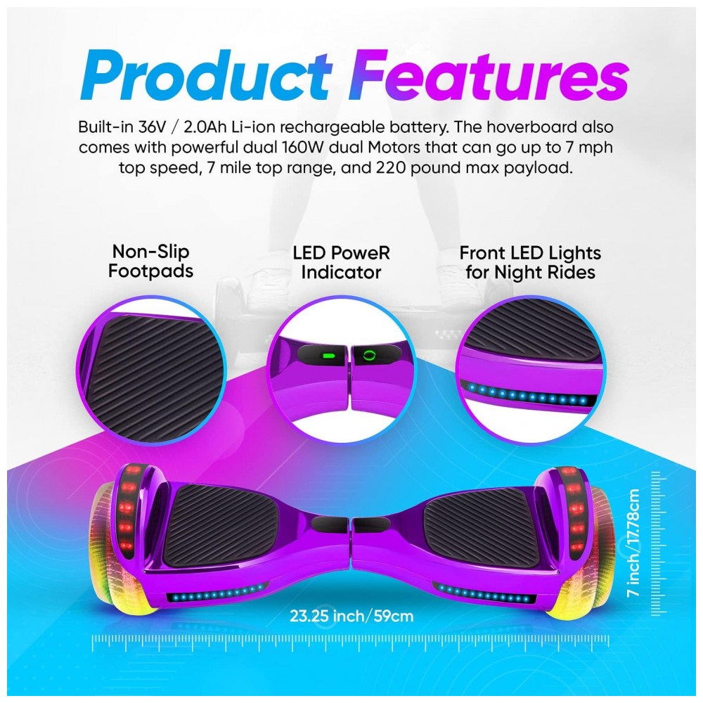 O hoverboard Emaxusa Roxo oferece diversão, estilo e segurança para crianças de 6 a 12 anos. As rodas estilo túnel totalmente LED proporcionam um show de luzes deslumbrante durante o passeio, adicionando visual e segurança ao trajeto. Certificado UL2272, atende aos mais altos padrões de segurança elétrica, de bateria e de carregamento, garantindo tranquilidade para os pais.