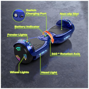O hoverboard Hoverstar Cromo Azul é a combinação perfeita de diversão, segurança e estilo para crianças e adolescentes. Certificado pelo padrão de segurança UL dos EUA, garante desempenho elétrico seguro e confiável. Equipado com faróis de alta intensidade e luzes LED nas rodas, proporciona uma experiência de passeio iluminada e divertida.