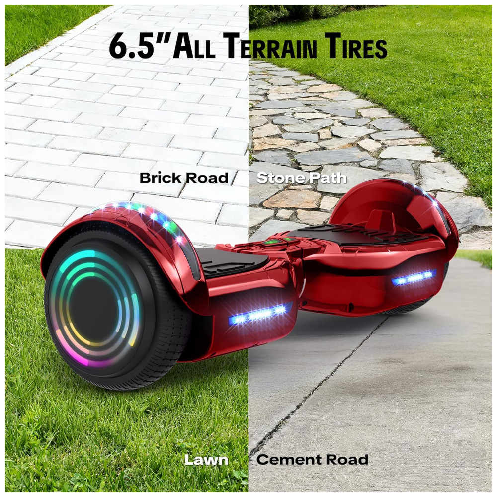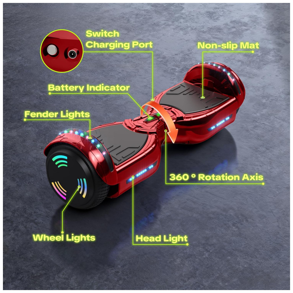O hoverboard Hoverstar Cromo Vermelho é ideal para crianças e adolescentes que procuram diversão, estilo e segurança. Certificado pelo padrão UL dos EUA, garante desempenho elétrico seguro e confiável. Equipado com faróis de alta intensidade e rodas com luzes LED, proporciona passeios mais seguros e iluminados.