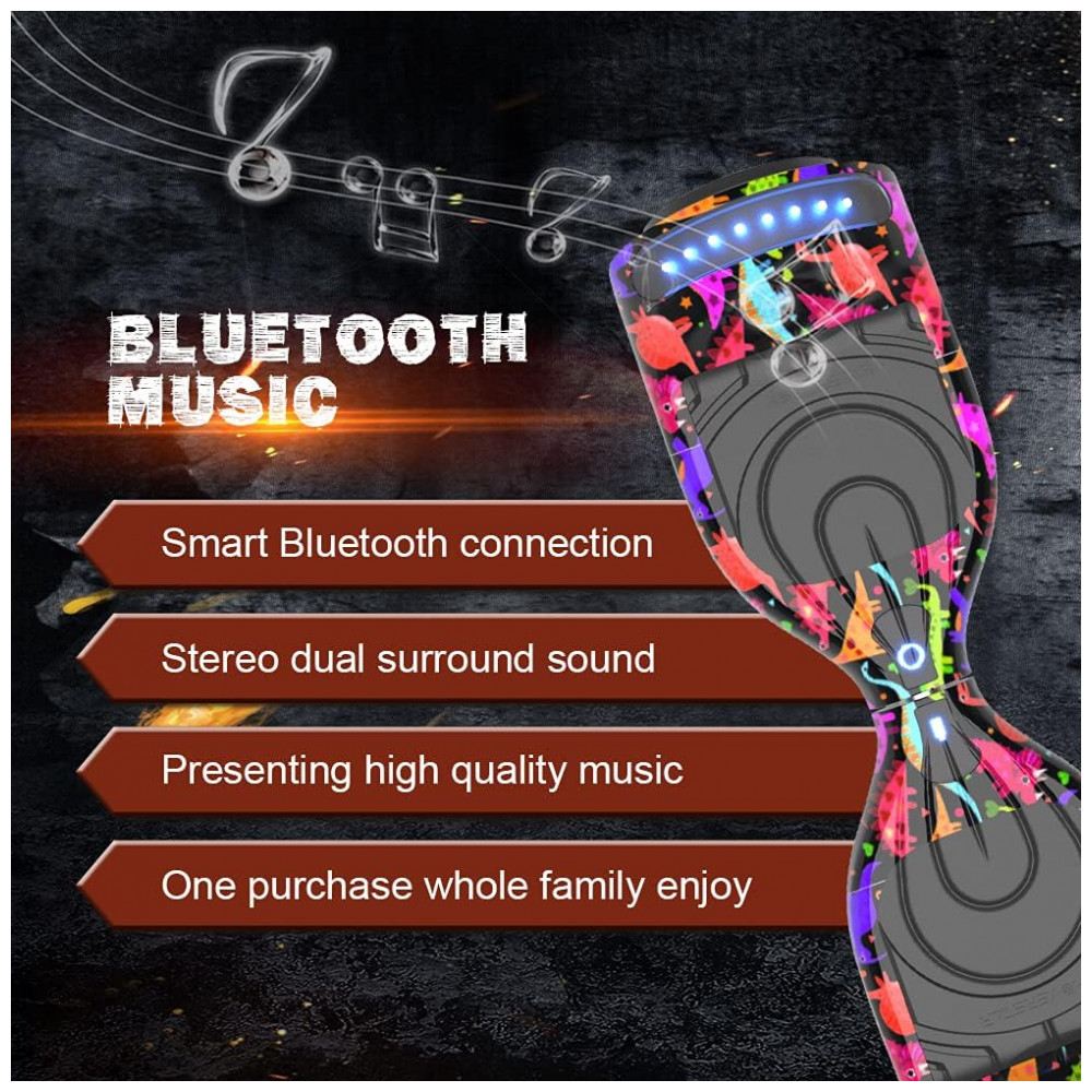 O Hoverboard HOVERSTAR HS2.01 na divertida versão Revestido Dinossauro combina diversão, segurança e tecnologia em um design resistente e atraente. Com sistema de autoequilíbrio intuitivo, é ideal para iniciantes e proporciona estabilidade durante o uso. Equipado com rodas de LED piscantes e alto-falante Bluetooth integrado, permite ouvir música diretamente do hoverboard, tornando cada passeio uma experiência visual e sonora completa. Suporta usuários de até 54 kg, com velocidade máxima de 10 km/h, sendo seguro e durável. Acompanha carregador, manual de instruções. Um presente perfeito para crianças, meninas e meninos, trazendo diversão em ocasiões especiais como aniversários, Natal e Halloween.