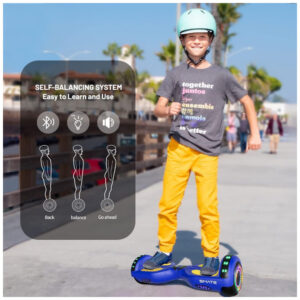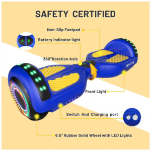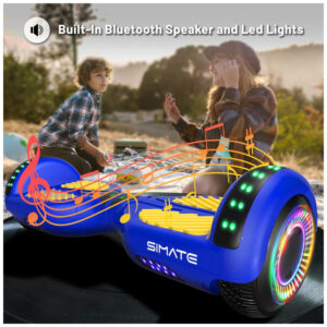 O hoverboard SIMATE Azul Amarelo foi projetado com tecnologia avançada de autoequilíbrio, sendo fácil de aprender e usar por pessoas de todas as idades. Com rodas de borracha sólida de 6,5 polegadas e estrutura em alumínio resistente, suporta até 100 kg e atinge velocidade máxima de 12 km/h, proporcionando passeios seguros e divertidos.