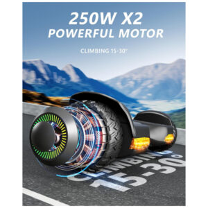 Desempenho e Potência: Com dois motores de 250W, o SIMATE Preto alcança uma velocidade máxima de até 13,7 km/h e é capaz de subir inclinações de até 15°, tornando-o ideal para diversos tipos de terreno, desde calçadas urbanas até trilhas leves.