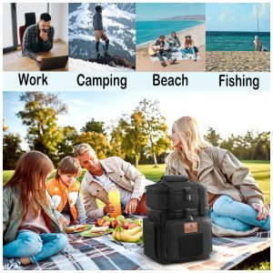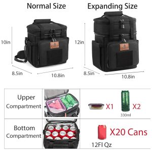 Grande capacidade tamanho máximo 20L, cola para 24 latas de cola. Fato para a maioria das caixas de bento e lancheiras. 2 compartimentos isolados para diferentes usos, o compartimento superior da lancheira resistente é expansível, aumentando a altura em 3,66 polegadas. Tamanho normal com 16L, prático de usar para festas, viagens, praia, piquenique, caminhadas, camping.