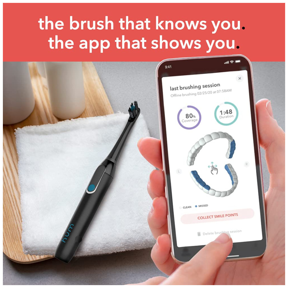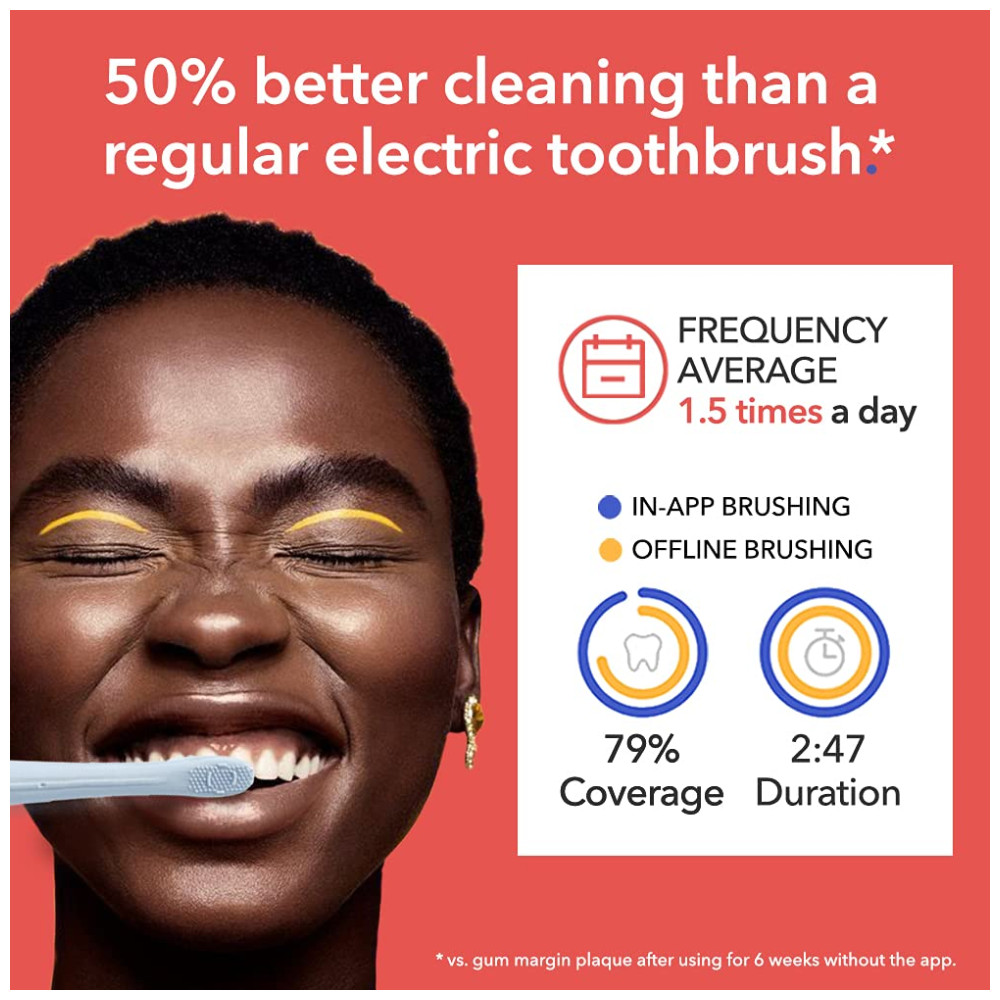 ESCOVA MELHOR a escova de dentes inteligente Hum sincroniza perfeitamente com um aplicativo e, juntos, eles rastreiam sua cobertura, frequência e duração e fornecem orientação personalizada para ajudá lo a escovar melhor