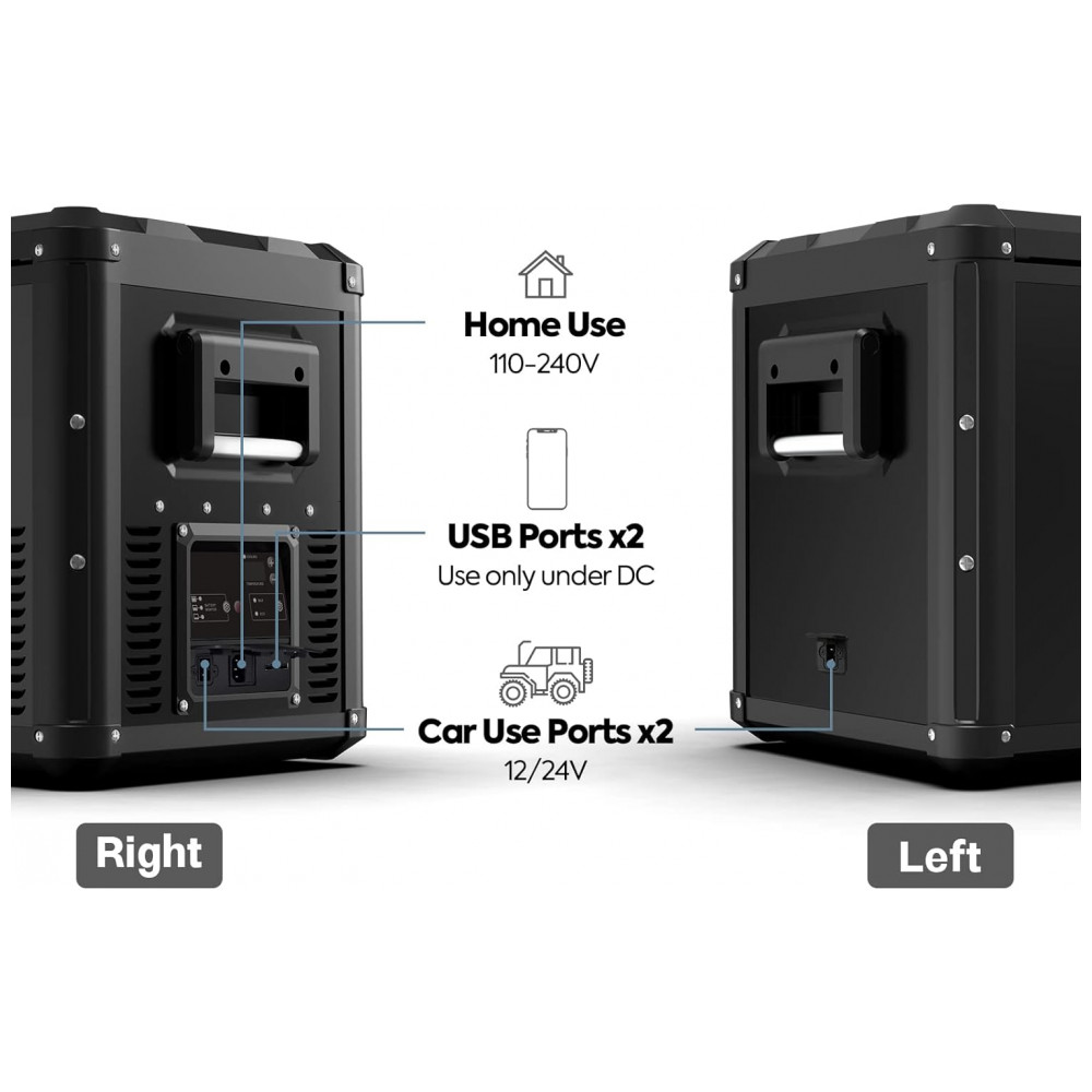Plugues convenientes As portas 12, 24 V DC estão instaladas em ambos os lados do refrigerador. 2 tomadas USB projetadas para carregar dispositivos móveis disponível apenas com alimentação DC. O transformador CA integrado permite que você resfrie previamente o refrigerador na tomada de 110 240V da sua casa.