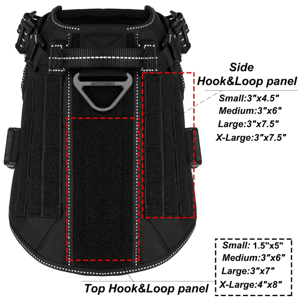 CÃO IDENTIFICADO Três tiras de de painel de gancho e laço costuradas em ambos na formação de MOLLE tamanho em Pequeno 7 x Médio 7 x Grande , X grande , XX grande 7 x Uma tira de painel de laço costurada ao longo da parte de trás do arnês com larguras diferentes em cada tamanho Pequeno médio , grande X grande , XXL Um Painel de loop quadrado costurado no peito frontal tamanho em pequeno 5 x Médio 5 x Grande , X grande 5 x XX grande 7 x , você Pode anexar muitos patches para identificar seu cão.