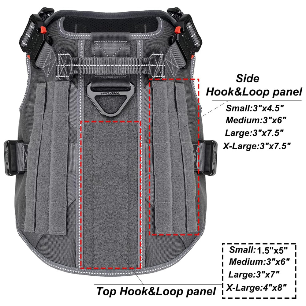 CÃO IDENTIFICADO Três tiras de de painel de gancho e laço costuradas em ambos na formação de MOLLE tamanho em Pequeno 7 x Médio 7 x Grande , X grande , XX grande 7 x Uma tira de painel de laço costurada ao longo da parte de trás do arnês com larguras diferentes em cada tamanho Pequeno médio , grande X grande , XXL Um Painel de loop quadrado costurado no peito frontal tamanho em pequeno 5 x Médio 5 x Grande , X grande 5 x XX grande 7 x , você Pode anexar muitos patches para identificar seu cão.