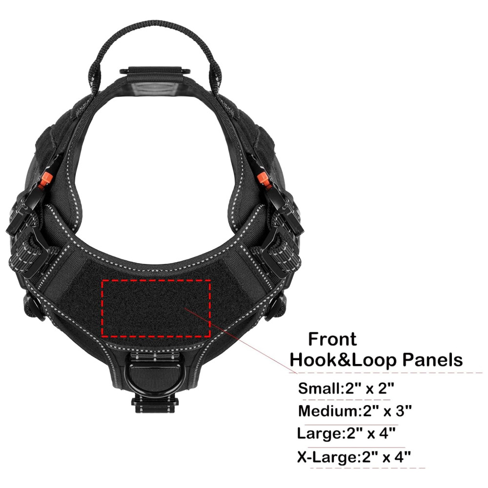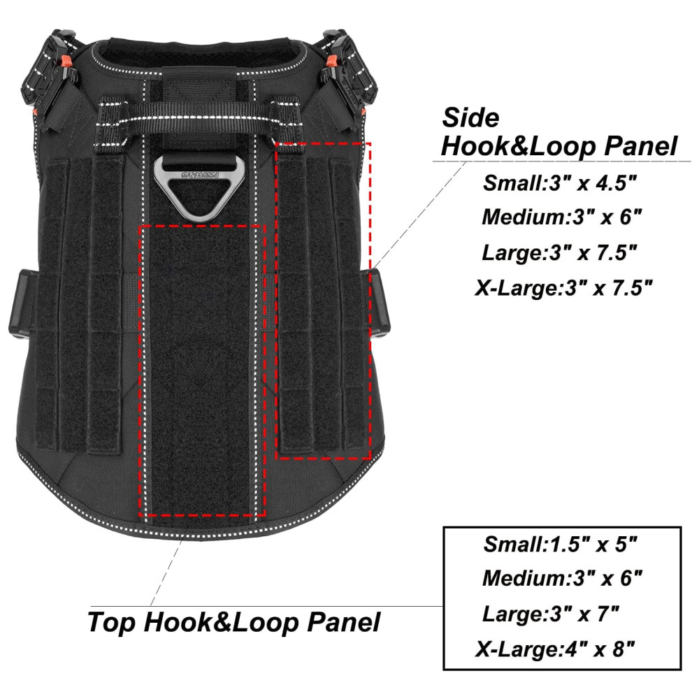 CÃO IDENTIFICADO Três tiras de de painel de gancho e laço costuradas em ambos na formação de MOLLE tamanho em Pequeno 7 x Médio 7 x Grande , X grande , XX grande 7 x Uma tira de painel de laço costurada ao longo da parte de trás do arnês com larguras diferentes em cada tamanho Pequeno médio , grande X grande , XXL Um Painel de loop quadrado costurado no peito frontal tamanho em pequeno 5 x Médio 5 x Grande , X grande 5 x XX grande 7 x , você Pode anexar muitos patches para identificar seu cão.