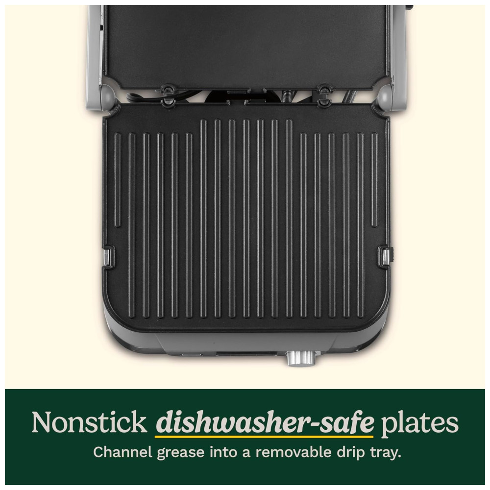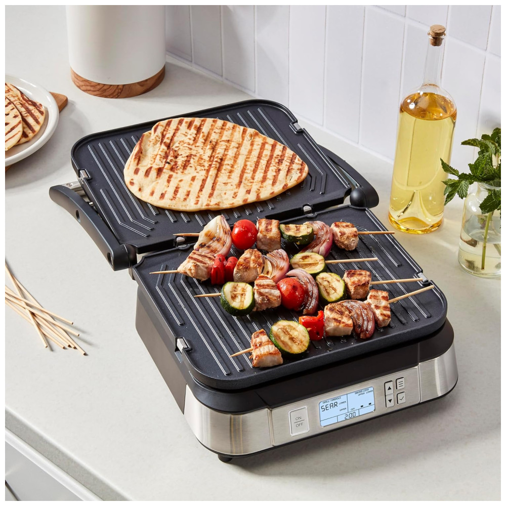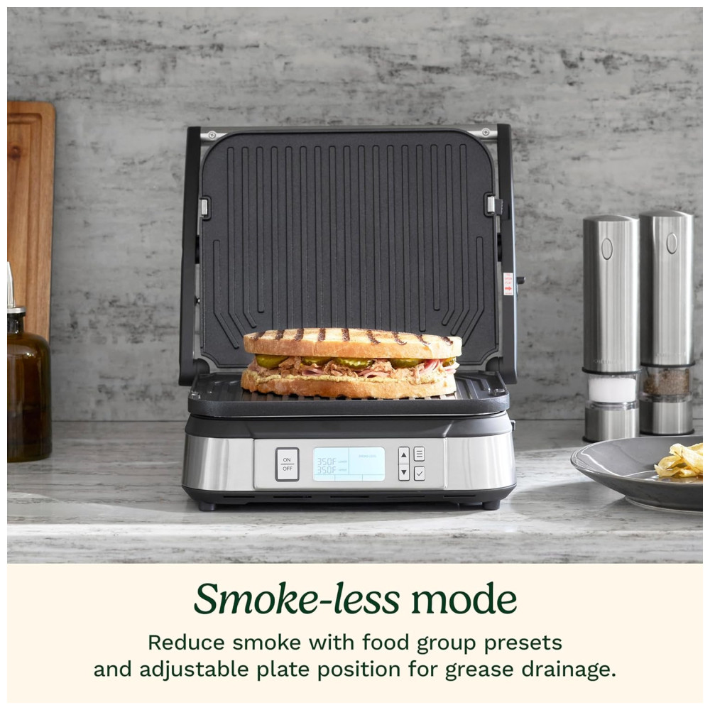 Recursos do modo Smoke less predefinidos para grupos de alimentos incluem carne bovina, aves, peixes e carne de porco Extensão dianteira do pé dobrável e posição adicional da placa superior para drenagem de graxa Placas recém projetadas para gerenciamento aprimorado de gordura