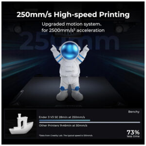 A Impressora 3D Creality Ender 3 V3 SE oferece uma velocidade máxima de impressão de 250 mm/s e aceleração de 2500 mm/s², o que resulta em uma economia de tempo de 73% em comparação com outras impressoras mantendo a qualidade de impressão. Equipada com o novo extrusor direto ‘Sprite’, essa impressora é capaz de imprimir com precisão filamentos como PLA, TPU, PETG, entre outros, garantindo alimentação suave e descarga sem falhas. O sistema de auto nivelamento CR Touch e sensor de tensão eliminam a necessidade de ajustes manuais, garantindo maior facilidade durante o processo de impressão. Com eixos Z duplos estáveis e eixos Y lineares, oferece alta precisão e estabilidade na impressão, evitando desvios. Montagem rápida e fácil em apenas 3 etapas, sem complicações.