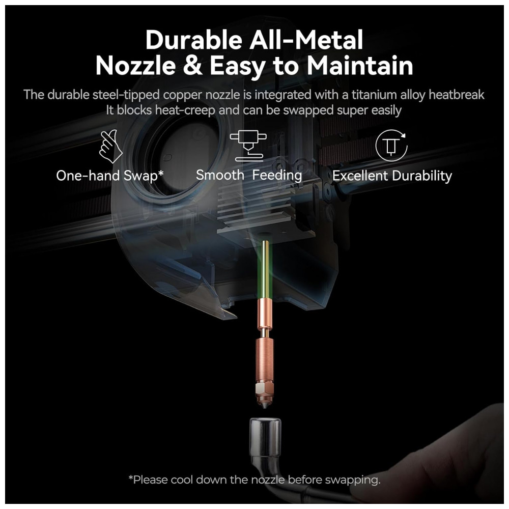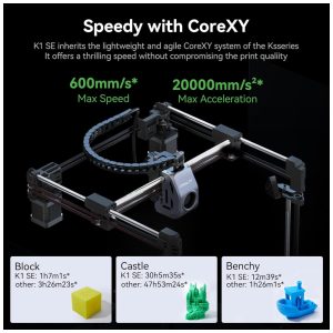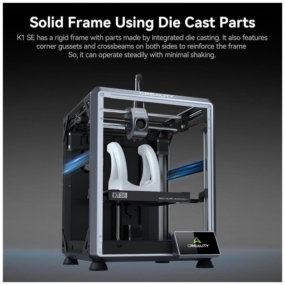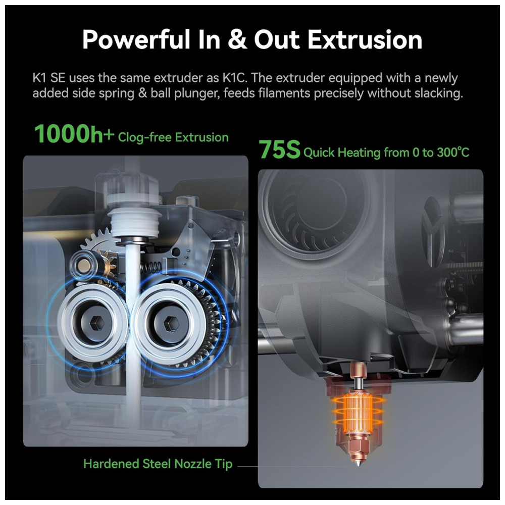 A Impressora 3D Creality K1 SE herda o sistema ágil CoreXY da série K1, sendo 12 vezes mais rápida que as impressoras 3D normais. Com velocidade máxima de 600mms e aceleração de 20000mms, mantém a qualidade de impressão em alta velocidade. Equipada com a confiável extrusora Flagship, a K1 SE garante alimentação precisa de filamentos, incluindo TPU flexível. O bico Trimetal durável permite trocas rápidas e aquecimento rápido em 75s. Estrutura sólida, autocalibração com um toque, experiência plug-and-play e ventoinha antivibração são alguns dos destaques. Além disso, conta com o sistema Creality OS baseado em Klipper e Creality Cloud, oferecendo uma plataforma completa para personalização e impressão 3D.