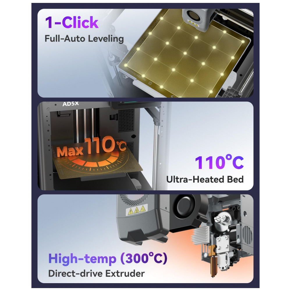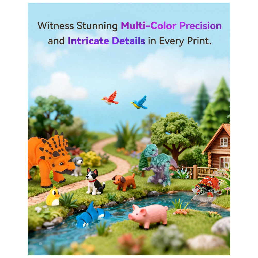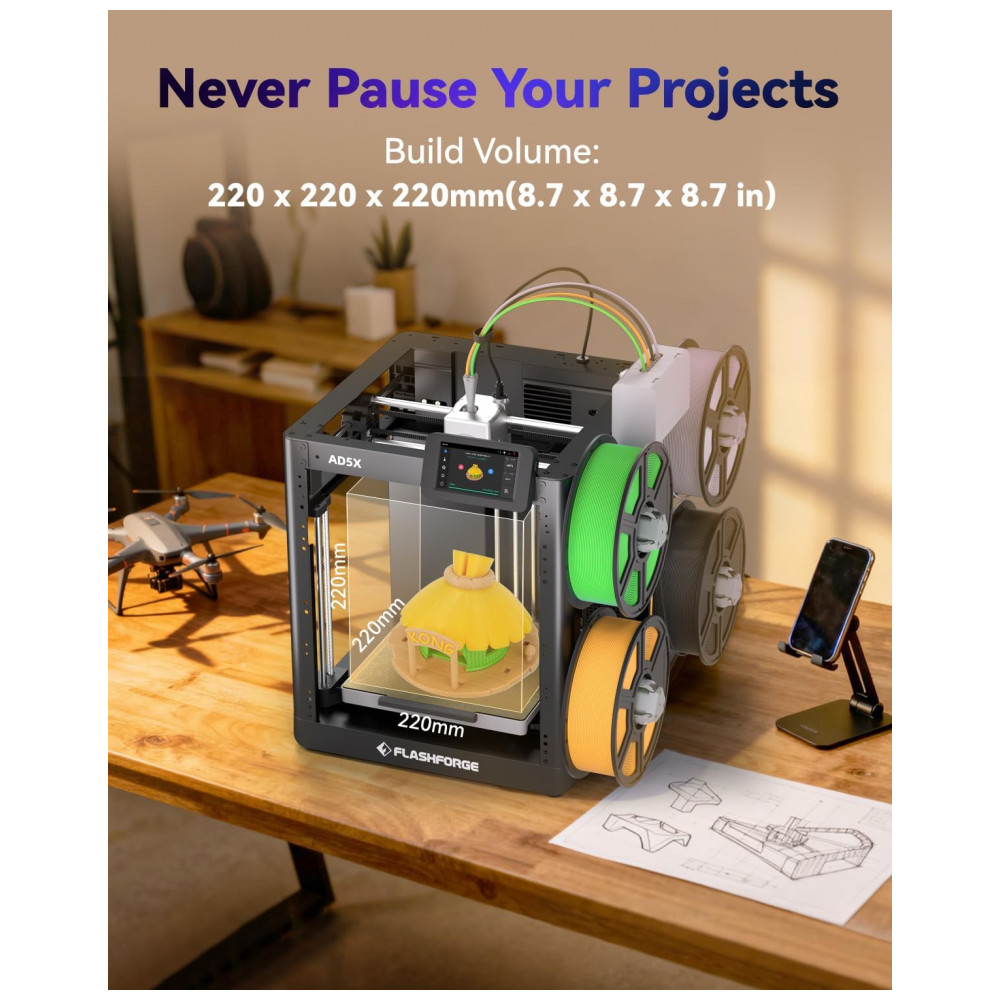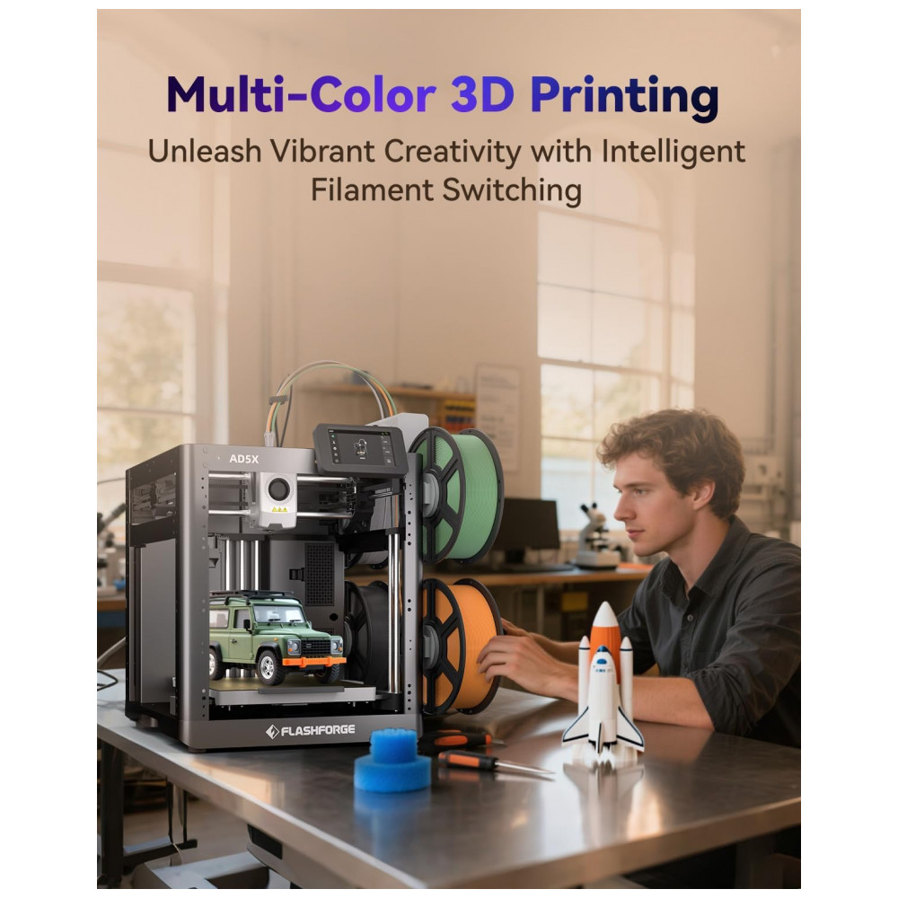 A Impressora 3D FLASHFORGE AD5X oferece impressão multicolorida com a tecnologia IFS, que permite troca inteligente de filamento, possibilitando impressões vibrantes e intricadas em um único trabalho de impressão. Seu sistema de nivelamento totalmente automático garante uma cama de impressão perfeitamente nivelada para resultados consistentes e de alta qualidade. Com velocidade de impressão de até 600mm/s, a AD5X proporciona impressões rápidas e eficientes, economizando tempo sem comprometer a precisão. O bocal de alta temperatura, chegando a 300°C, torna a impressora compatível com uma ampla gama de filamentos, incluindo PLA, ABS, PETG e mais. Utilizando a tecnologia FDM para desempenho confiável, a FLASHFORGE AD5X garante impressões precisas e confiáveis, tornando-a adequada tanto para iniciantes quanto para profissionais.
