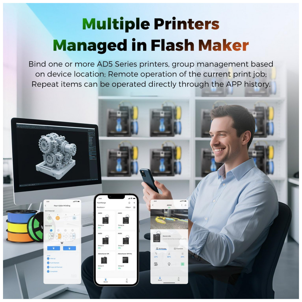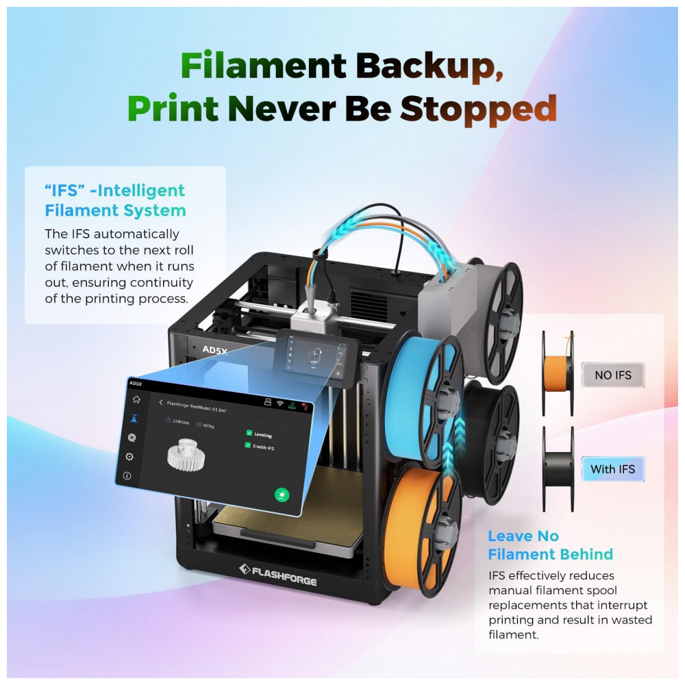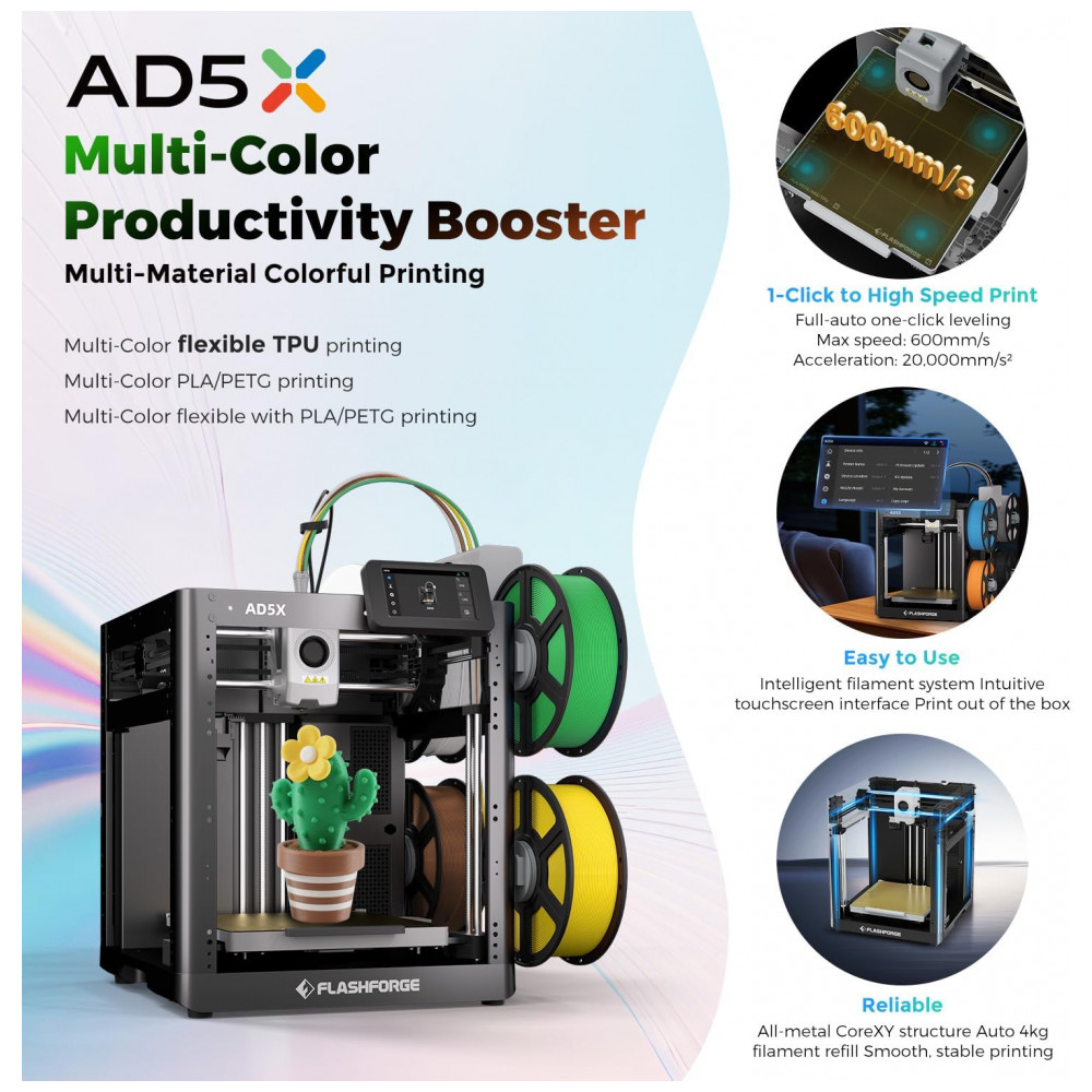 A FLASHFORGE AD5X é uma impressora 3D de 4 cores com 410g de filamentos de PLA de alta velocidade.