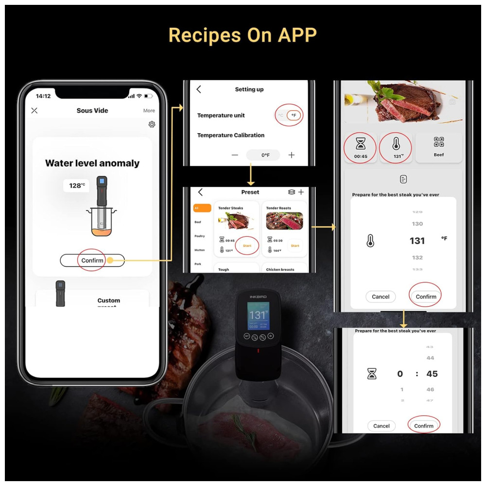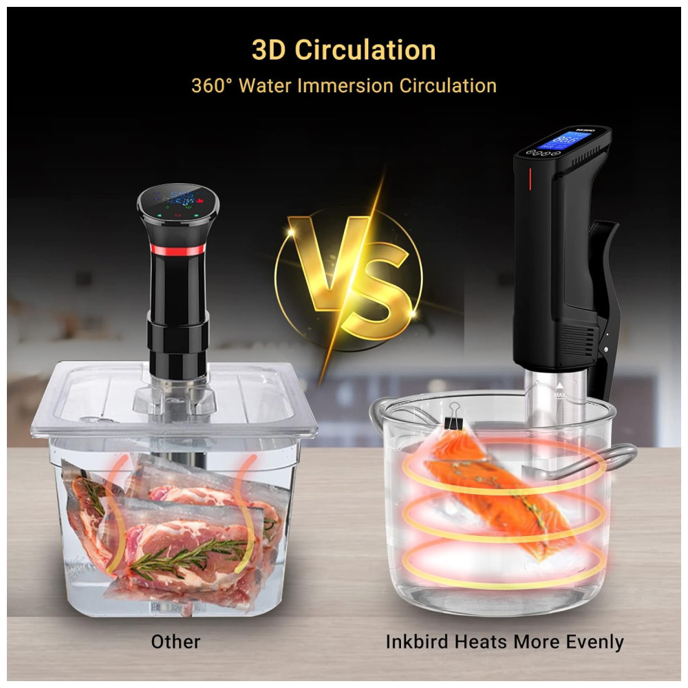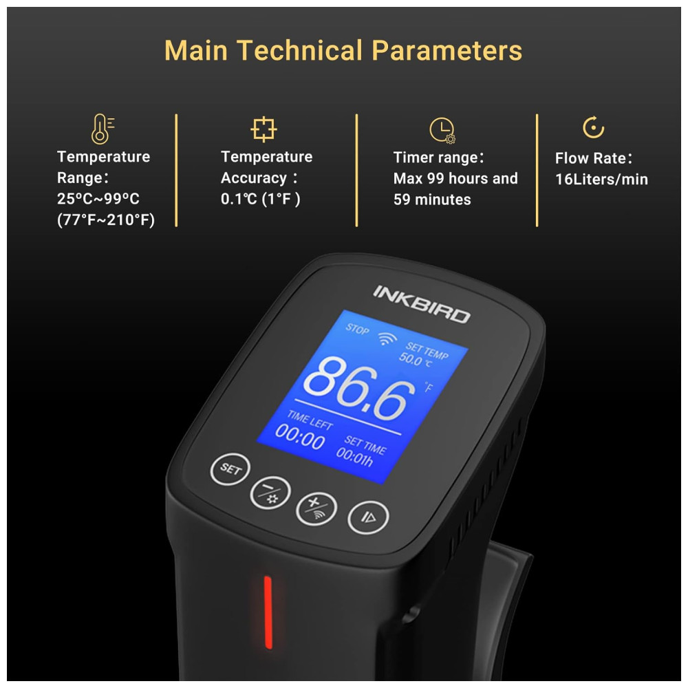 Fogão de precisão e design inteligente O circulador de imersão Inkbird apresenta uma ampla faixa de temperatura de 77 210 F 25 99 C com precisão de 0,1 C e configuração do temporizador máximo de 99 horas controles de toque de LCD intuitivos permitem ajuste e rastreamento sem esforço