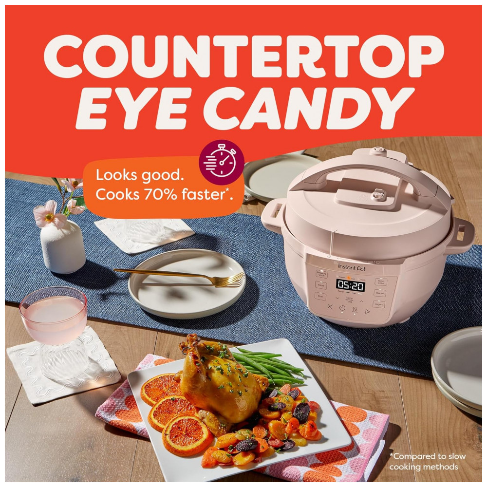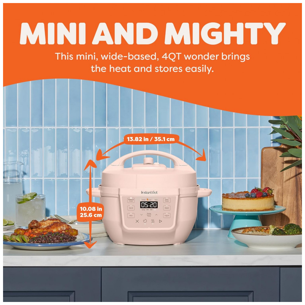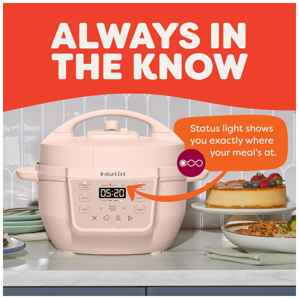 Pequeno e poderoso. Tudo o que você ama em uma Instant Pot, agora em um tamanho compacto para levar para qualquer lugar. Com 7 funções de cozimento: panela de pressão, panela lenta, refogue, cozimento a vapor, fazer arroz, iogurte e manter as refeições aquecidas, tudo em um dispositivo compacto. Fácil de guardar, oferecendo a mesma superfície de cozimento de uma panela de 8 polegadas. Com capacidade de 4 litros, perfeita para até 4 porções, ideal para estudantes, solteiros e famílias pequenas. Indicador de progresso permite monitorar o status do cozimento facilmente. Design anti-giro garante que a panela fique estável para mexer e refogar sem esforço. Acabamento Rosewater adiciona um toque moderno à sua cozinha. Cozinhe até 70 mais rápido comparado aos métodos tradicionais. Limpeza rápida e fácil com a tampa e panela de aço inoxidável que podem ser lavadas na lava-louças. Possui mais de 10 recursos de segurança comprovados, incluindo proteção contra superaquecimento e tampa de travamento automático. Desempenho potente com 800 watts, 110 V 60 Hz, UL ULC Listado. Inclui uma versátil grade de vapor de aço inoxidável.