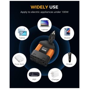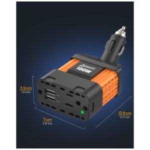 Um inversor realmente poderoso. Fornece saída contínua de energia de 100 W DC para CA e capacidade de pico de 300 W, recursos com soquete de 110 V, mais porta USB terra e 2.1A Char Carregamento inteligente e . Permite carregar de maneira rápida e segura telefones, tablets, e outros dispositivos alimentados por USB simultaneamente Ultra compacto e leve design do tamanho do iPhone para economia de espaço e fácil de zenar em seu porta luvas ou apoio de braço, plug in direto e design de plug ajustável que suportam o plugue giratório para inclinar e para ser conectado a praticamente qualquer veículo para equipamentos e baterias. Fusível embutido e desligamento automático e saídas de ventilação de três lados contra sobretensão , baixa tensão , sobrecarga , curto circuito , superaquecimento. O ABS Shell possui isolamento elétrico robusto e bom isolamento O que você obtém Todos os nossos inversores têm certificação ETL