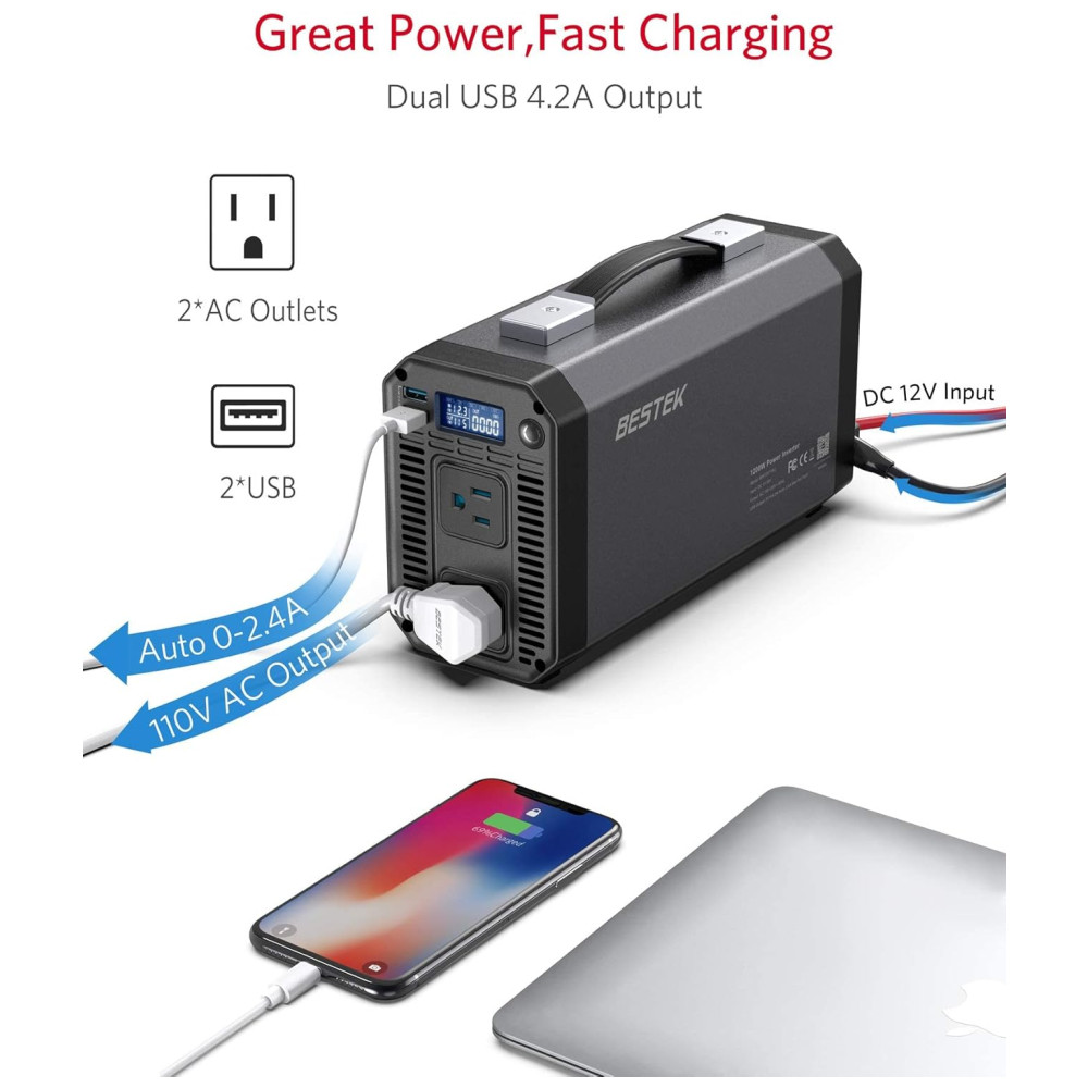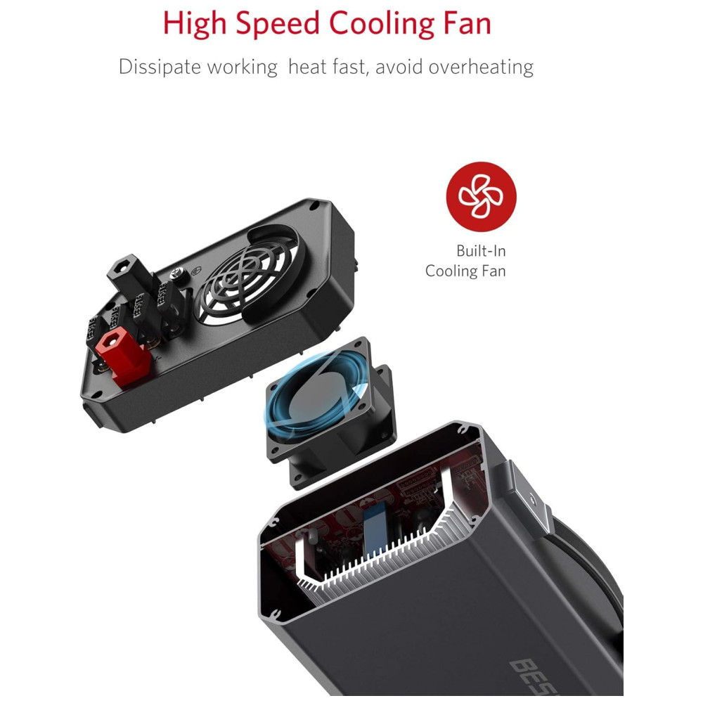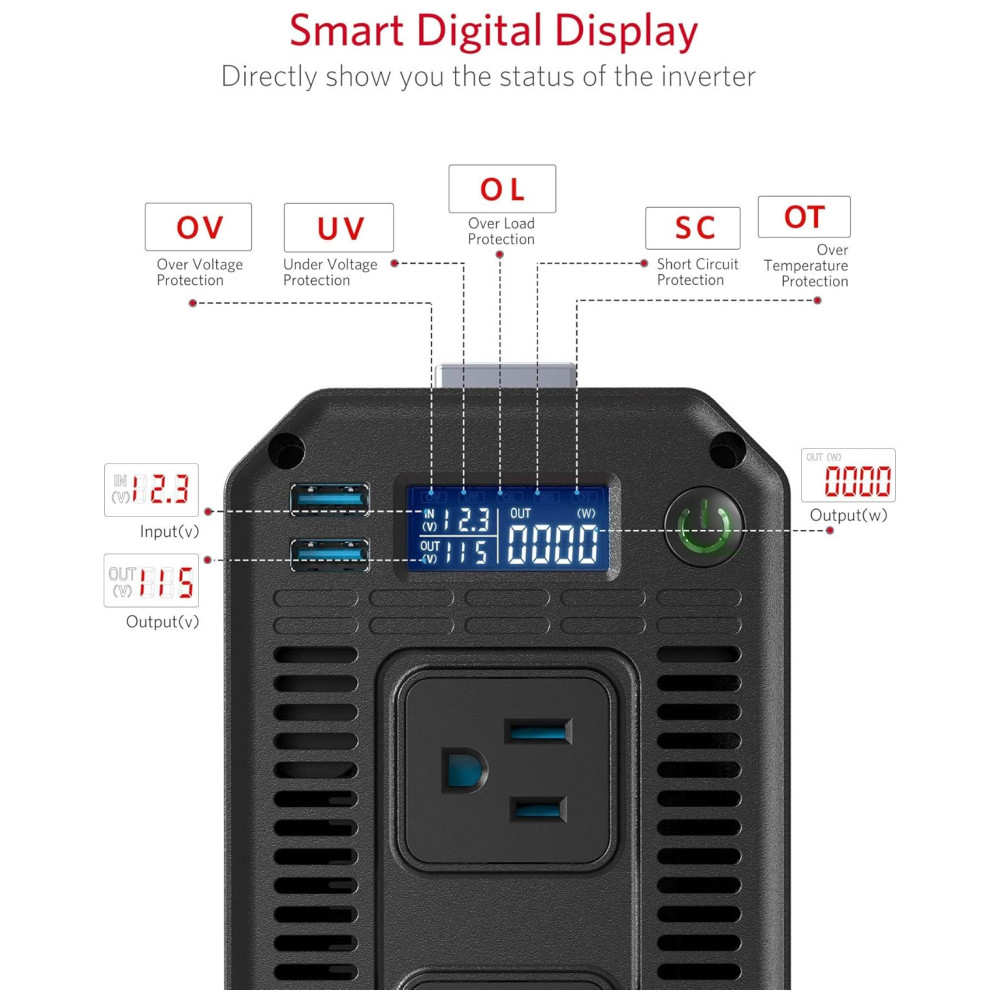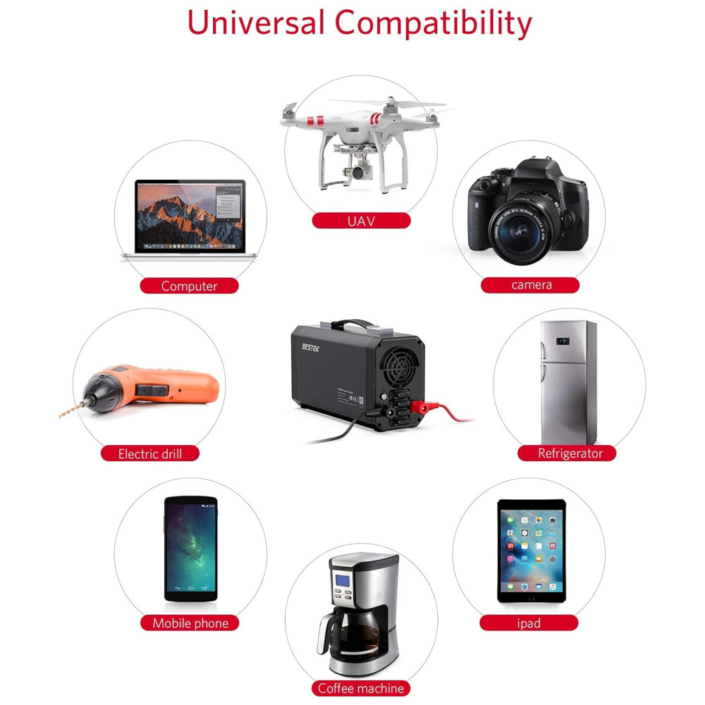 Power Inversor de energia da BESTEK Marca de inversor de energia n 1 da América. Forneça energia contínua de 1200 W DC para CA, com 2 tomadas CA e 2 portas de carregamento rápido USB, display LCD digital. Carregamento poderoso. Tomadas duplas de 110V CA para alimentar dispositivos maiores, como laptops e tablets ou qualquer outro aparelho doméstico com menos de 1200 watts, 2 portas USB Auto 0 2,4A para carregar dispositivos alimentados por USB. Uma boa opção para camping, necessidades ao ar livre ou viagem de carro no caminho. Display LCD digital. Pode mostrar a tensão de entrada , saída, potência de saída e indicação de proteção em tempo útil, conveniente para você dominar o status de trabalho do inversor. Ventilador de refrigeração silencioso. Equipado com um ventilador inteligente, ele gira automaticamente em velocidade diferente de acordo com a carga de energia e a temperatura, esse design pode ajudar a reduzir o ruído do ventilador. Além disso, o ventilador de alta velocidade protege o inversor contra superaquecimento. Multi proteção. O fusível embutido de eres para proteger seu dispositivo e bateria. A tecnologia de carregamento fornece proteção contra superaquecimento, carregamento de sub , sobretensão, sobrecarga e curtos circuitos