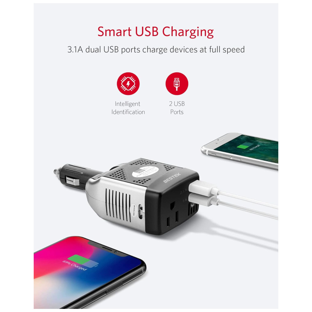 Inversor de Potência 150W 12V para 2 Portas USB 3.1A Alta Velocidade e AC 110v BESTEK MRI1511C Preto