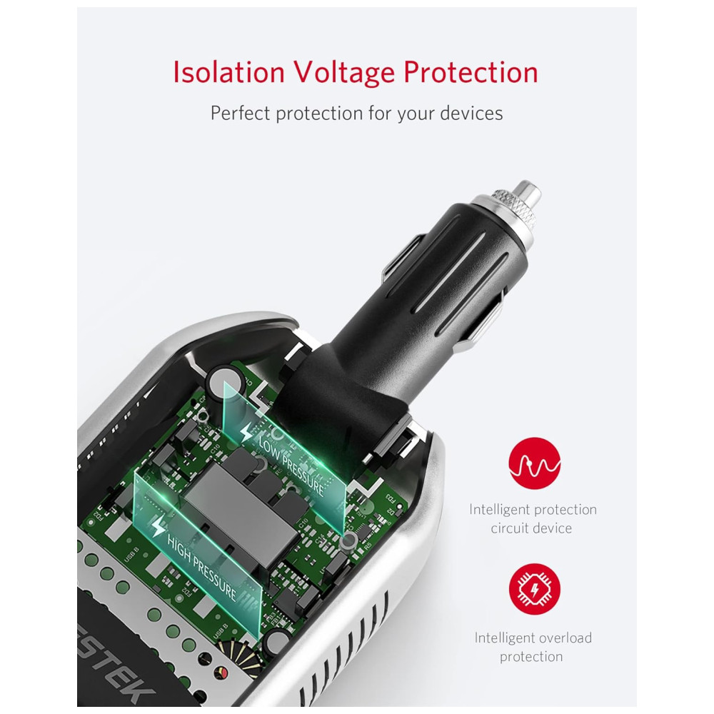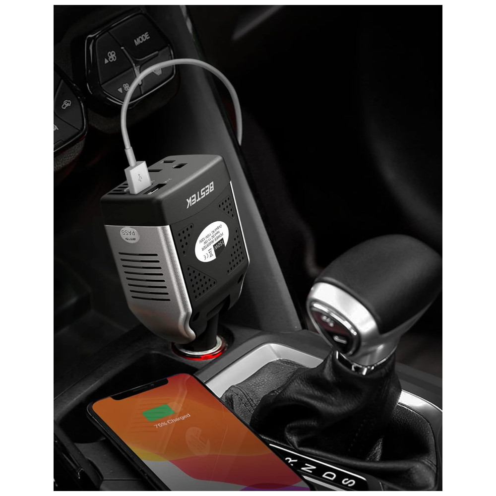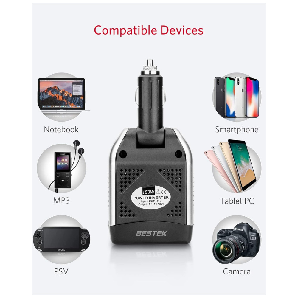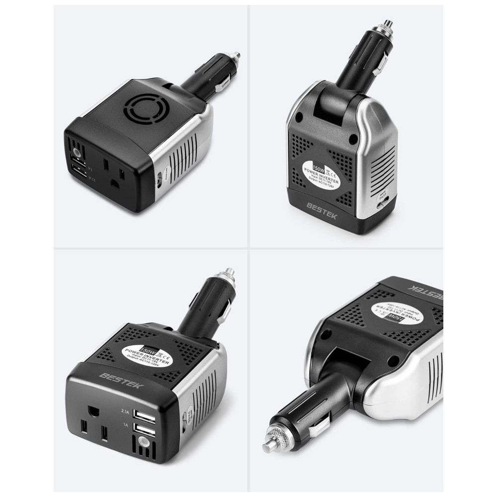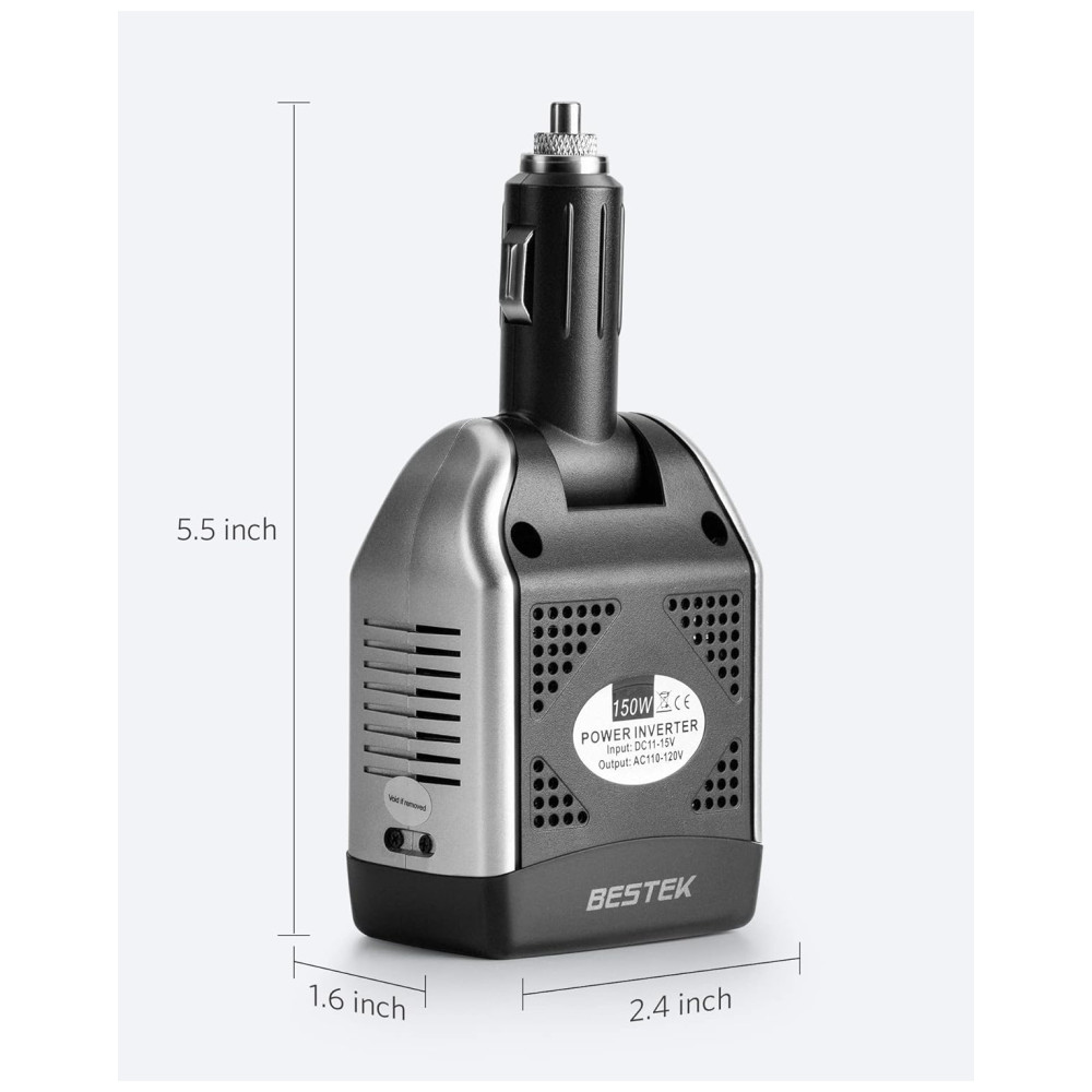 Vantagem BESTEK a marca de inversor de energia n 1 dos EUA. Fornece energia contínua de 150 watts DC para CA e 360 watts de potência de pico inversor DC para CA transforme a tensão de 12V DC para 110V DC, a tomada CA e as portas de carregamento USB 3.1A duplas, ideais para alimentar laptops, tablets, smartphones, energia banco e outros dispositivos eletrônicos Conveniente e fácil de usar conecte diretamente qualquer tomada de isqueiro de 12V e fácil de ajustar com a cabeça giratória Multi Proteção ventilador de resfriamento integrado e desligamento automático evitam o superaquecimento, a sobrecarga dos dispositivos e do carro, carga baixa, curto circuito, baixa tensão e sobretensão O que você obtém Inversor BESTEK 150W, guia de boas vindas