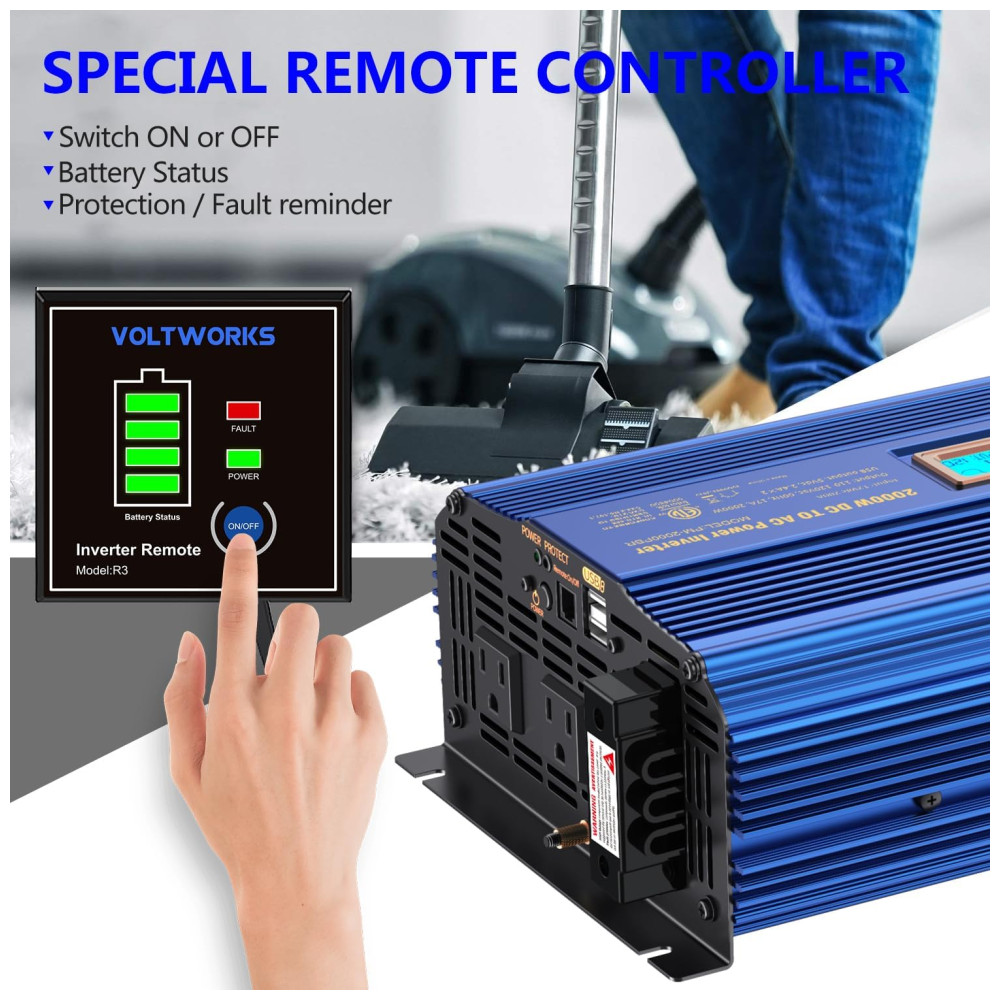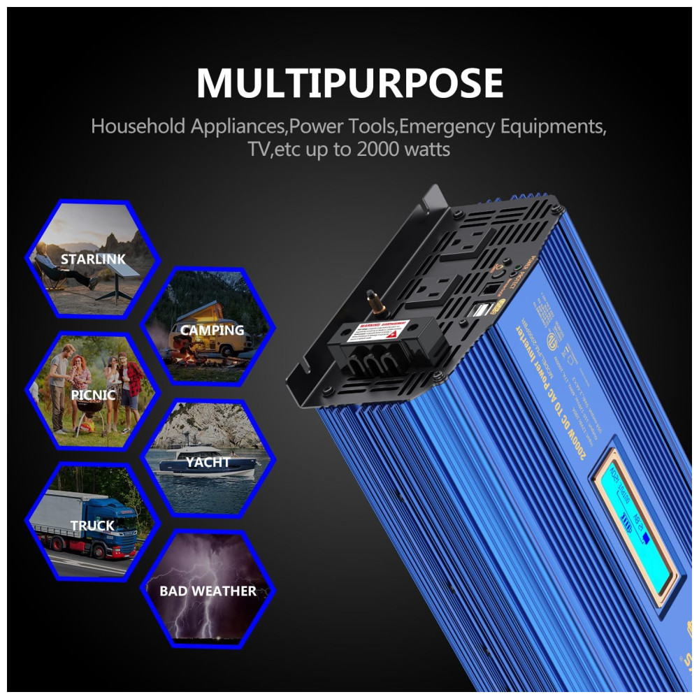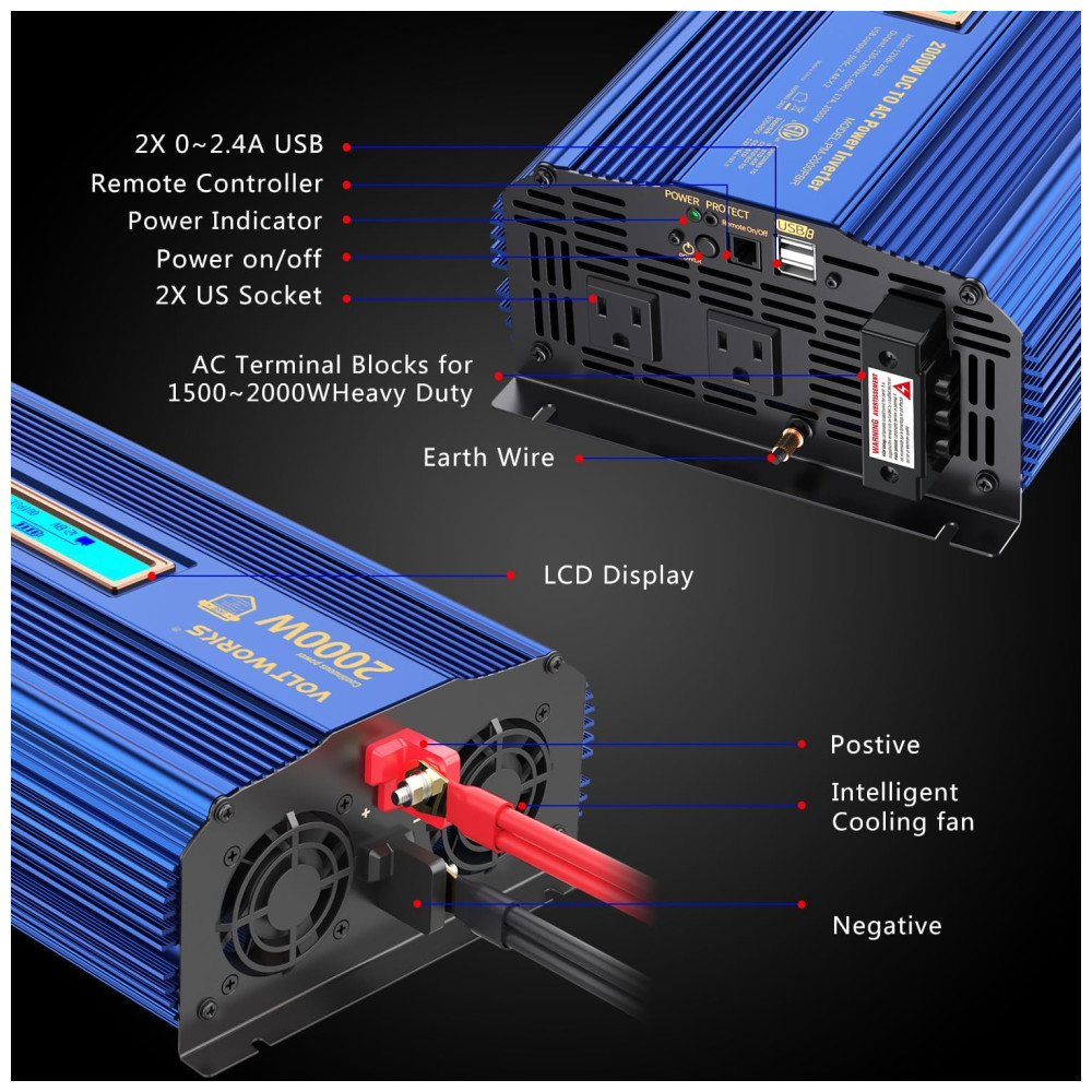Fornece 100 de 2000 watts CC de 12 volts para energia contínua de 120 volts CA, potência de pico de até 4000 watts, vem com 3 tomadas CA e portas USB 2×2.4A Possui 2×2.4A, detecta automaticamente e carrega rapidamente seus dispositivos até 2,4 lâmpadas, totalmente portas USB de 4.8A, que podem alimentar a maioria dos seus dispositivos compatíveis com USB. E as 3 tomadas CA também são adequadas para alimentar dispositivos maiores, como eletrodomésticos, ferramentas elétricas etc. DISPLAY LCD E CONTROLE REMOTO. Apresentado com um display LCD, que permite que você saiba a tensão de entrada e saída para que você possa saber o status de uso da sua bateria. E o controle remoto também é mais conveniente para você ligar , desligar o inversor Incluindo proteção contra curto circuito, proteção contra sobretensão, proteção de baixa tensão, proteção contra sobrecarga, proteção contra superaquecimento, projeto isolado de entrada e saída CARCAÇA DE ALUMÍNIO Proteja o inversor contra quedas e choques. E o ventilador de refrigeração embutido pode evitar superaquecimento