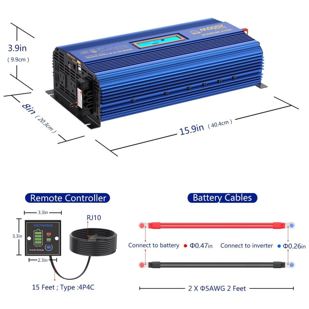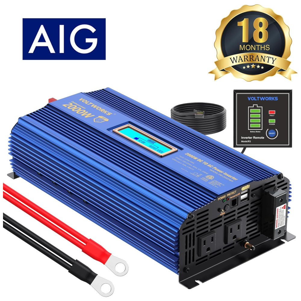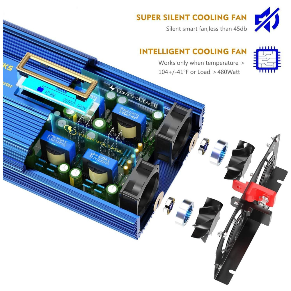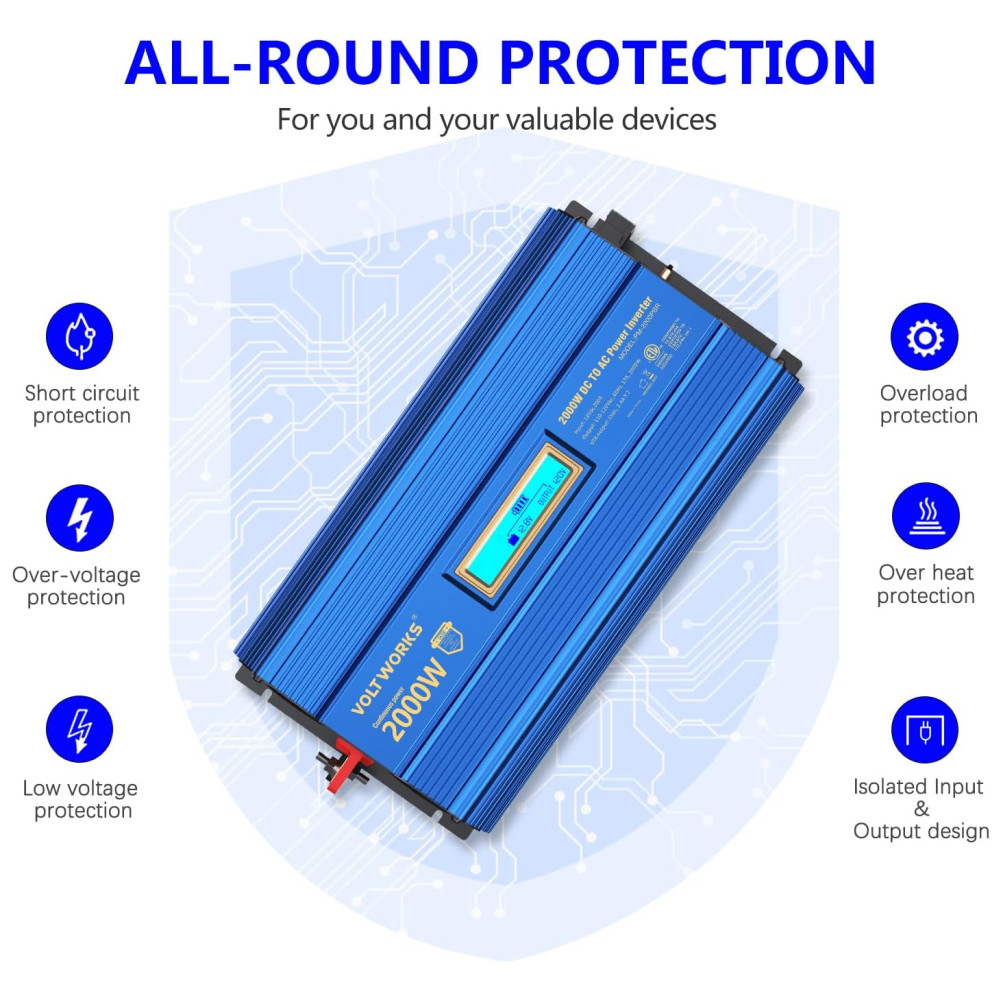 Fornece 100 de 2000 watts CC de 12 volts para energia contínua de 120 volts CA, potência de pico de até 4000 watts, vem com 3 tomadas CA e portas USB 2×2.4A Possui 2×2.4A, detecta automaticamente e carrega rapidamente seus dispositivos até 2,4 lâmpadas, totalmente portas USB de 4.8A, que podem alimentar a maioria dos seus dispositivos compatíveis com USB. E as 3 tomadas CA também são adequadas para alimentar dispositivos maiores, como eletrodomésticos, ferramentas elétricas etc. DISPLAY LCD E CONTROLE REMOTO. Apresentado com um display LCD, que permite que você saiba a tensão de entrada e saída para que você possa saber o status de uso da sua bateria. E o controle remoto também é mais conveniente para você ligar , desligar o inversor Incluindo proteção contra curto circuito, proteção contra sobretensão, proteção de baixa tensão, proteção contra sobrecarga, proteção contra superaquecimento, projeto isolado de entrada e saída CARCAÇA DE ALUMÍNIO Proteja o inversor contra quedas e choques. E o ventilador de refrigeração embutido pode evitar superaquecimento