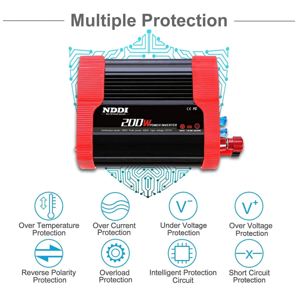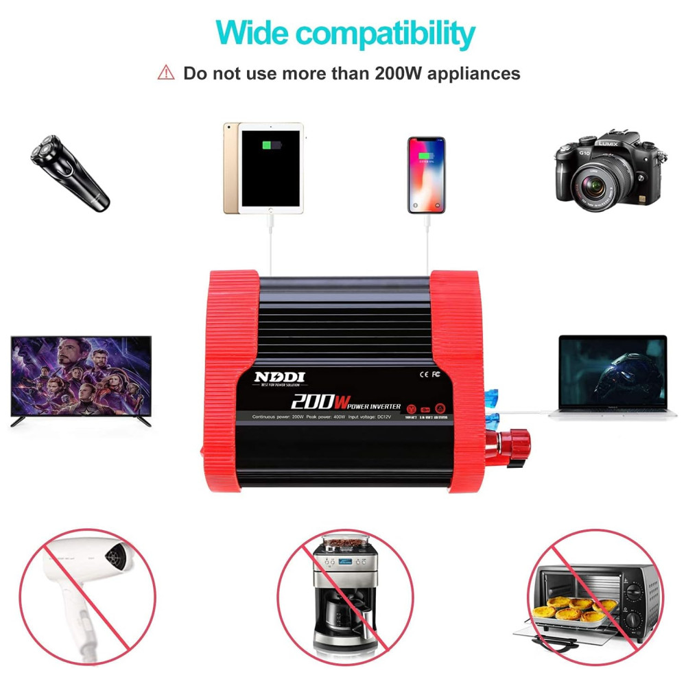 O inversor de energia NDDI com 2 tomadas AC 110V, 2 portas USB 3.1A, 1 plugue de isqueiro fornece energia estável para laptop, console de jogos, TV, iPad, smartphone e outros dispositivos eletrônicos. Inversor de 15, x x 6, 500 gramas, extremamente compacto e portátil, viagem de carro adequada, longa jornada, atividades ao ar livre, emergências etc. Conversor de carro feito de resistência ao fogo ABS e concha de metal, fusíveis embutidos, fornecem proteja totalmente seus dispositivos superaquecimento, carregamento de sobretensão, sobrecarga, curto circuito. O ventilador de refrigeração prolonga a vida útil do inversor. Um método mais eficiente é ler as instruções. Lista de embalagem inversor de potência de carro de 200W, 2 clipes de bateria, 1 plugue de isqueiro, 1 manual do usuário, 2 fusíveis de 15A. A NDDI é uma empresa de alta tecnologia para o desenvolvimento, fabricação e ização de conversores de automóveis avançados, sistema solar, carregador de energia de alta frequência e etc. a alta qualidade. Nosso objetivo é fornecer as melhores soluções profissionais de energia para você NOTA. Evite operar o inversor enquanto a mão estiver molhada. Evite inserir a CA no inversor de energia. Evite usar produtos que excedam o valor máximo do produto. Evite usar o plugue do isqueiro ao usar o inversor em dispositivos acima de 200W. Evite deixar o inversor de energia nos estados LIGADO enquanto o carro estiver desligado. Evite a exposição prolongada à luz solar, resultando em temperatura excessiva ou escaldadura do produto. Especificações Terno para bateria de 12V. Saída 110V. Potência 200W. Potência de pico 400W. Forma de onda de saída onda senoidal modificada. Portas de carregamento USB 3.1Amp compartilhada. Frequência 50 , 60Hz. Peso do inversor 500 gramas. Dimensões L x W x H 15, x x 6,. Na embalagem incluída 1 inversor de energia de 200W, 2 clipes de bateria, 2 fusíveis 15, 1 plugue de isqueiro, 1 manual do usuário