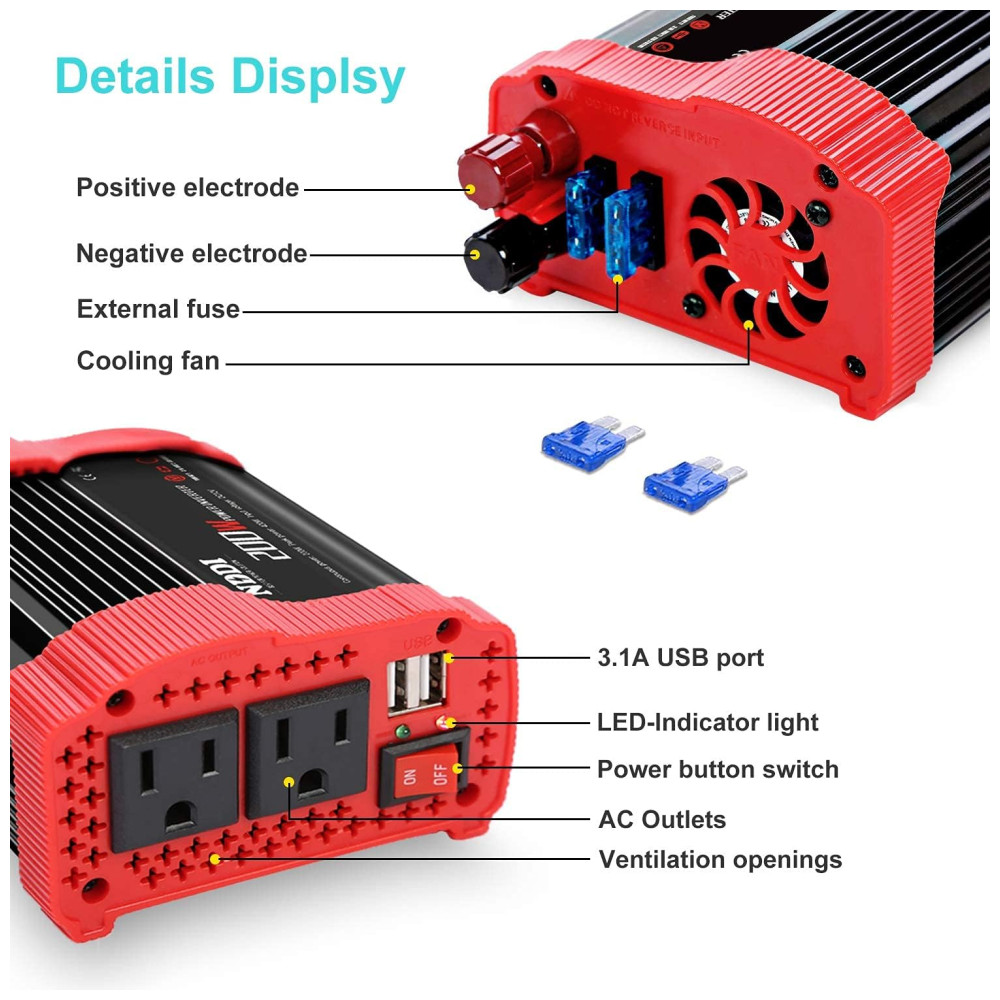 Inversor de Potência 200W 12V Para AC 2 Tomadas 2 USB 110v NDDI Vermelho