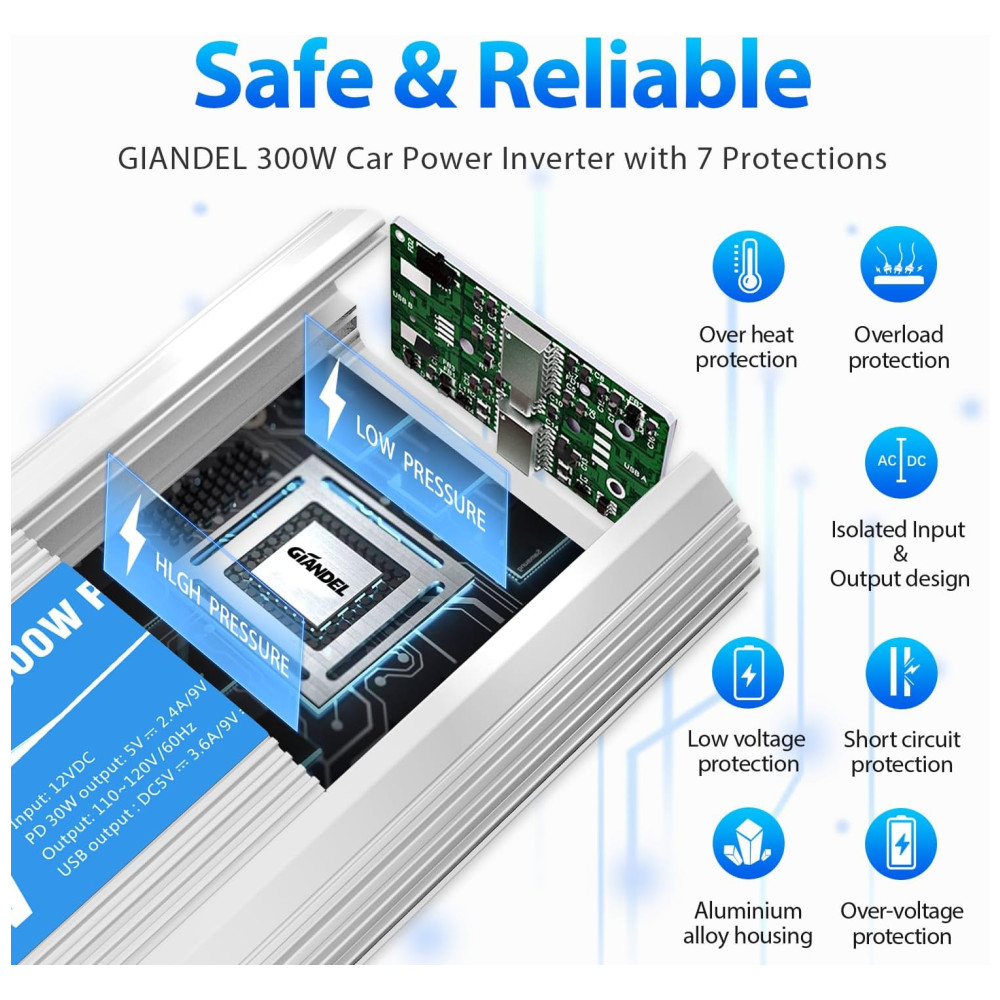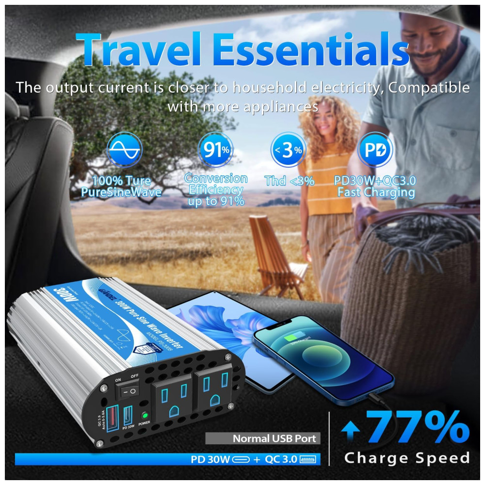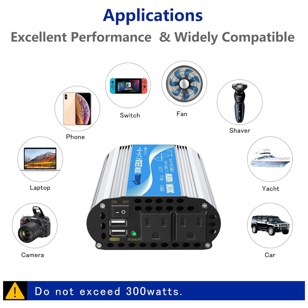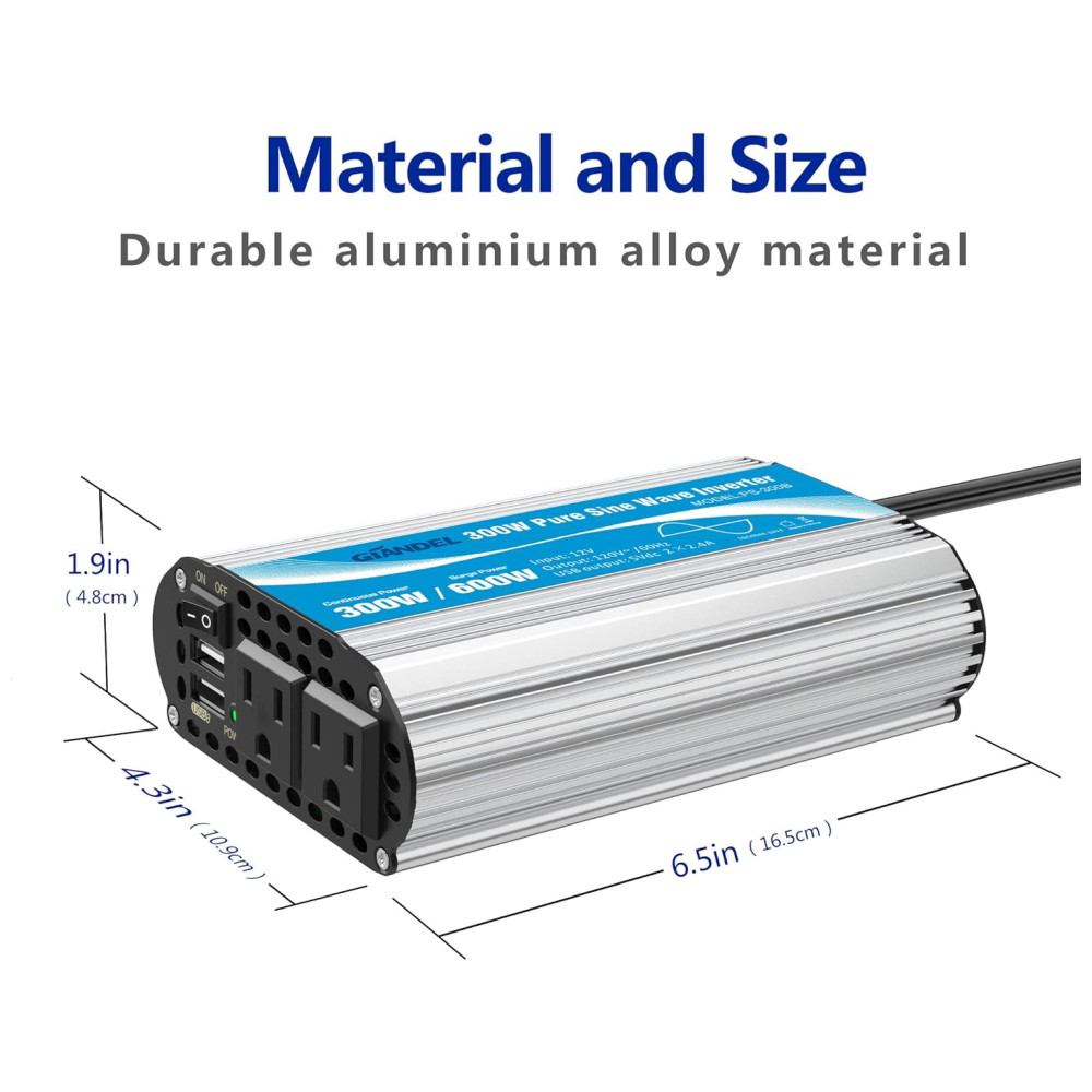 Este é um inversor de potência de onda senoidal pura de 300 Watts, com potência de pico de 600 Watts, com portas USB 2×2.4A e 2 tomadas CA. Poderoso e útil. Carregamento Inteligente este inversor de energia projetado com portas de carregamento USB, detecta automaticamente seus dispositivos para fornecer a velocidade de carregamento mais rápida de até 2,eres por porta, com total de 4,eres no máximo Compacto e leve o ventilador de refrigeração inteligente silencioso enquanto corre. O plugue do isqueiro é conveniente para você conectar diretamente a um soquete do isqueiro Totalmente proteções de segurança Sobretensão, Baixa tensão, Sobrecarga, Curto circuito, Proteção contra superaquecimento. Projeto isolado de entrada e saída, mais . A carcaça de liga de alumínio forte e durável oferece proteção avançada contra quedas e batidas. O ventilador de refrigeração integrado ajuda a reduzir o calor e evita a escassez