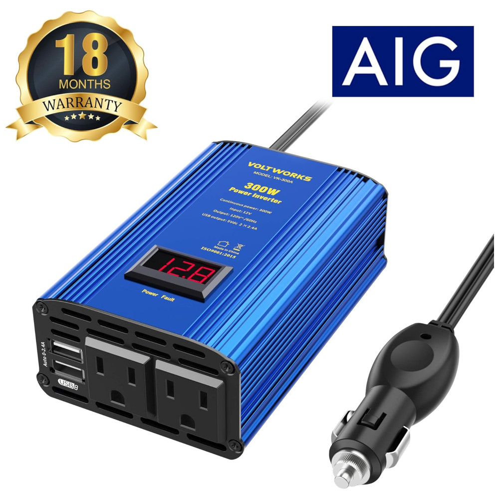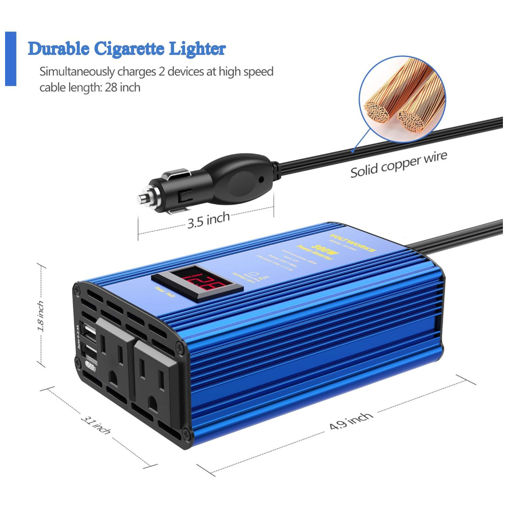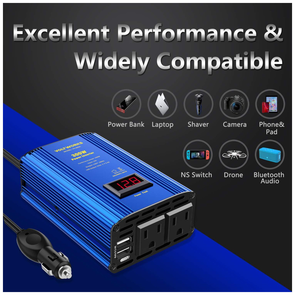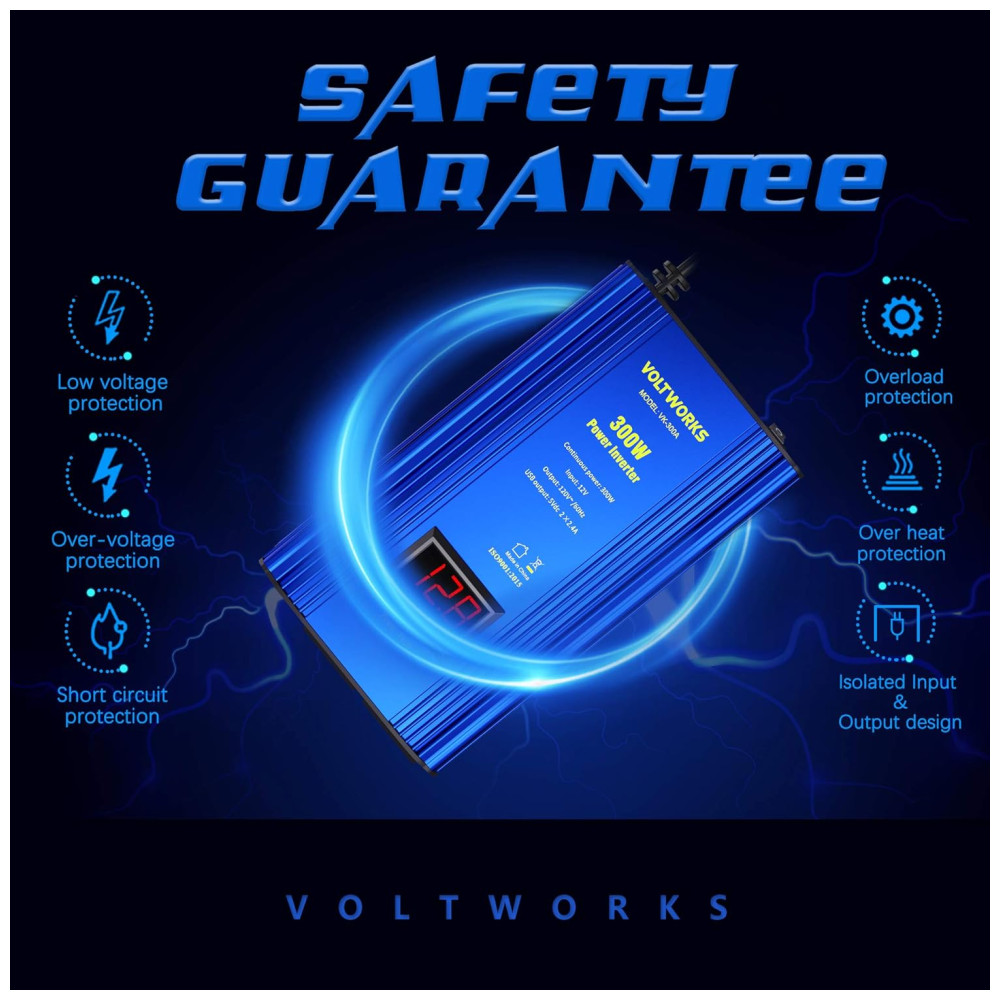Forneça 300 watts CC contínuos à energia CA e 600 watts de potência de pico, com 2 tomadas CA e 2 portas USB. APLICAÇÃO COMPACTA E AMPLA. Do tamanho de uma viagem, vem com duas tomadas de 120 V CA, portas USB de 2×2,4 A e um plugue de isqueiro, veículos quando você está de férias, em viagem e acampando. PROTEÇÃO AVANÇADA. Projetado com avançada tecnologia isolada de entrada e saída. Proteja totalmente seus dispositivos com proteção contra sobretensão, baixa tensão, sobrecarga, curto circuito e superaquecimento. CARCAÇA DURÁVEL. A carcaça de alumínio oferece uma melhor proteção contra quedas e batidas. E o sistema inteligente de ventiladores de refrigeração deixa o inversor muito silencioso, mesmo que esteja funcionando. Protege o inversor contra aquecimento e excesso de potência de saída. O pacote inclui Um inversor de potência de 300w, um manual do usuário