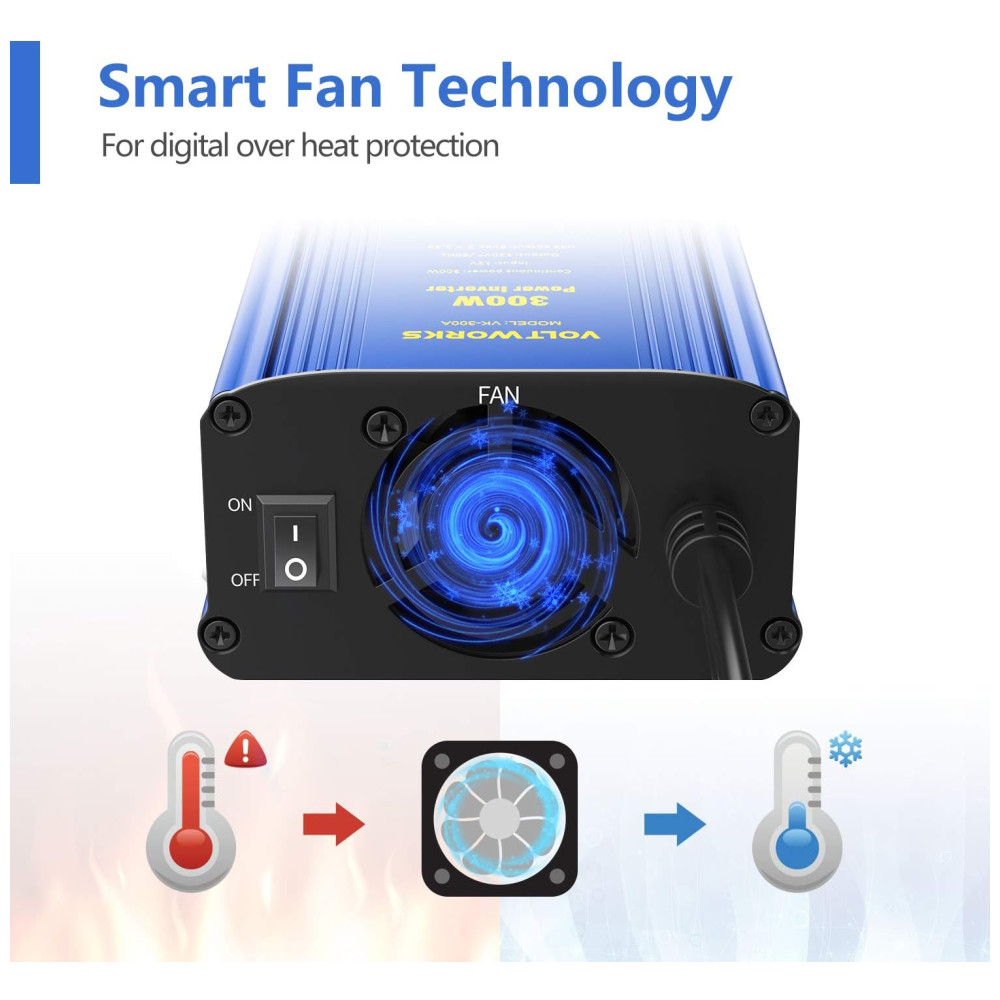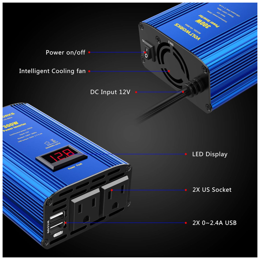Inversor de Potência 300W DC 12V para AC 2 Tomadas, 2 USB, 110v, VOLTWORKS VK 300A, Azul Aço