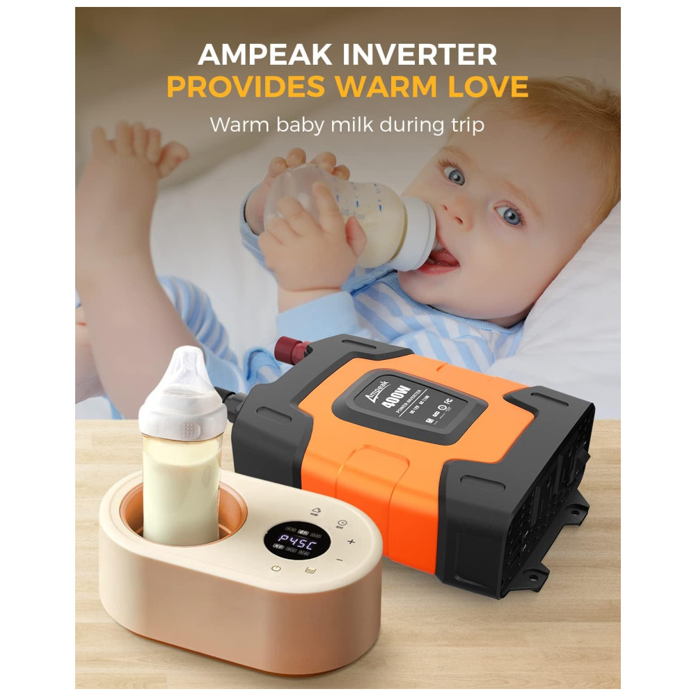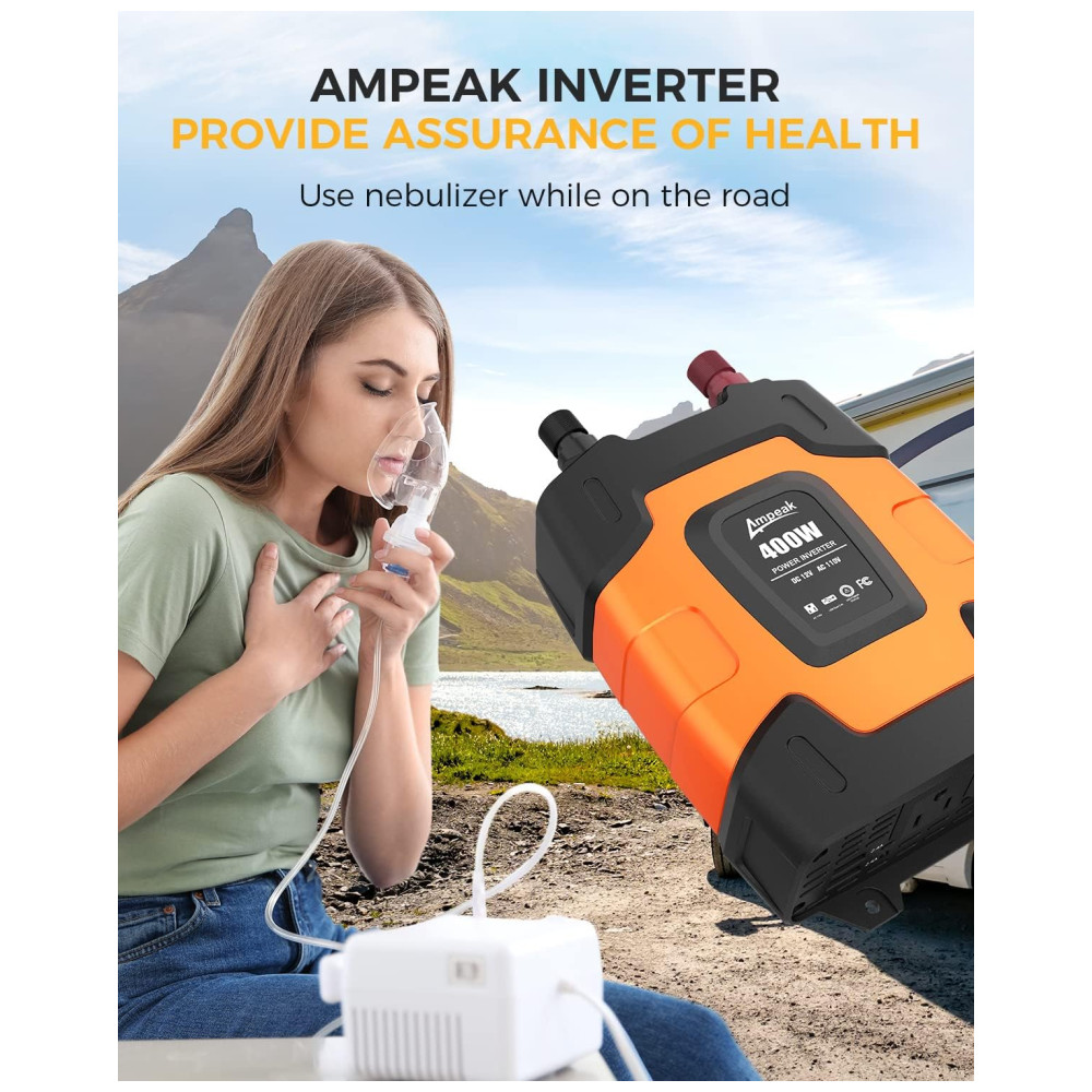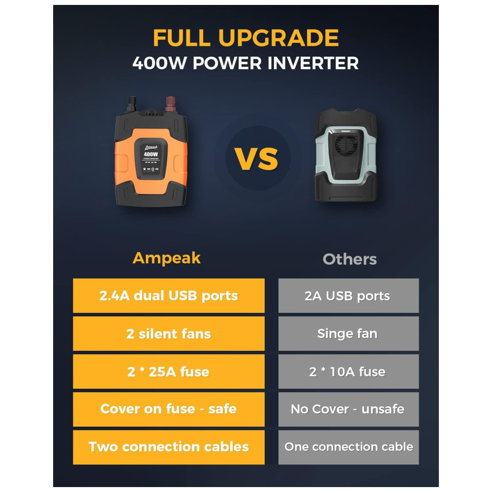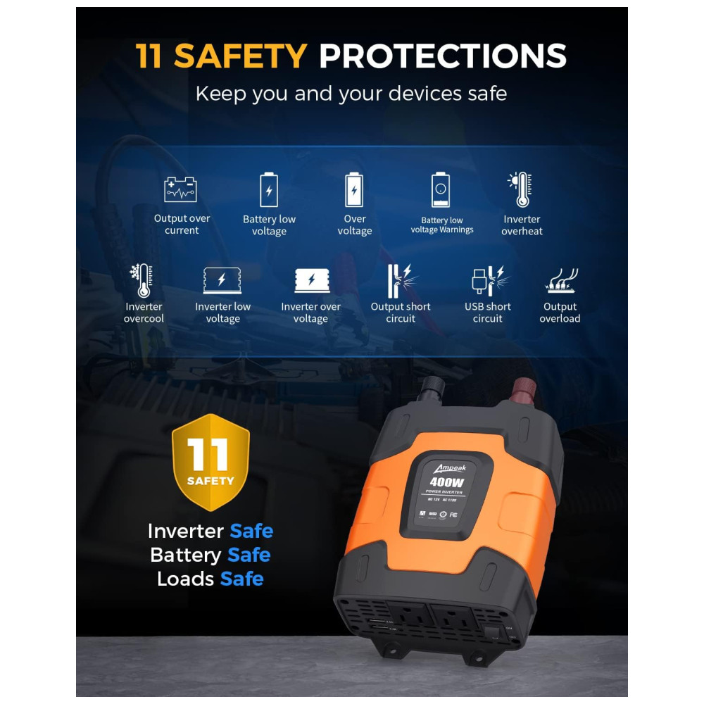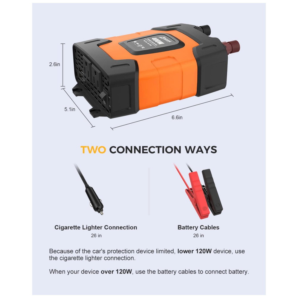 Um inversor realmente poderoso e prático. Fornece saída contínua de 400 W DC para CA, capacidade de surto de 800 W, recursos com soquete 110V CA e porta USB dupla 3.1A Cabos de clipe de bateria e cabo de isqueiro para conexão de fonte de energia diferente demandas. Portas de carregamento USB duplas de 3.1A, ótimas para carregamento rápido de iPod, Smartphone e outros dispositivos eletrônicos, Tomadas duplas de 110V CA ideais para carregar laptop, console de jogos, Kindle, TV, luzes de Natal etc. Ultra compacto e leve design do tamanho do iPhone para economia de espaço, fácil de zenar e transportar. Ideal para uso em viagens longas de carro, férias em família, viagens de trabalho e camping. O plugue do isqueiro de quase faz com que o inversor de energia possa ser conectado a praticamente qualquer veículo Proteção total. Mini fusível 35A substituível embutido. 2 Ventilador de refrigeração e alarme sonoro, proteção de desligamento automático contra sobretensão , baixa tensão , Sobrecarga , Curto circuito , Sobreaquecimento. Aplica a tecnologia de resistência ao choque do ABS, robusta e com bom isolamento elétrico O que você obtém Todos os nossos inversores têm certificação ETL