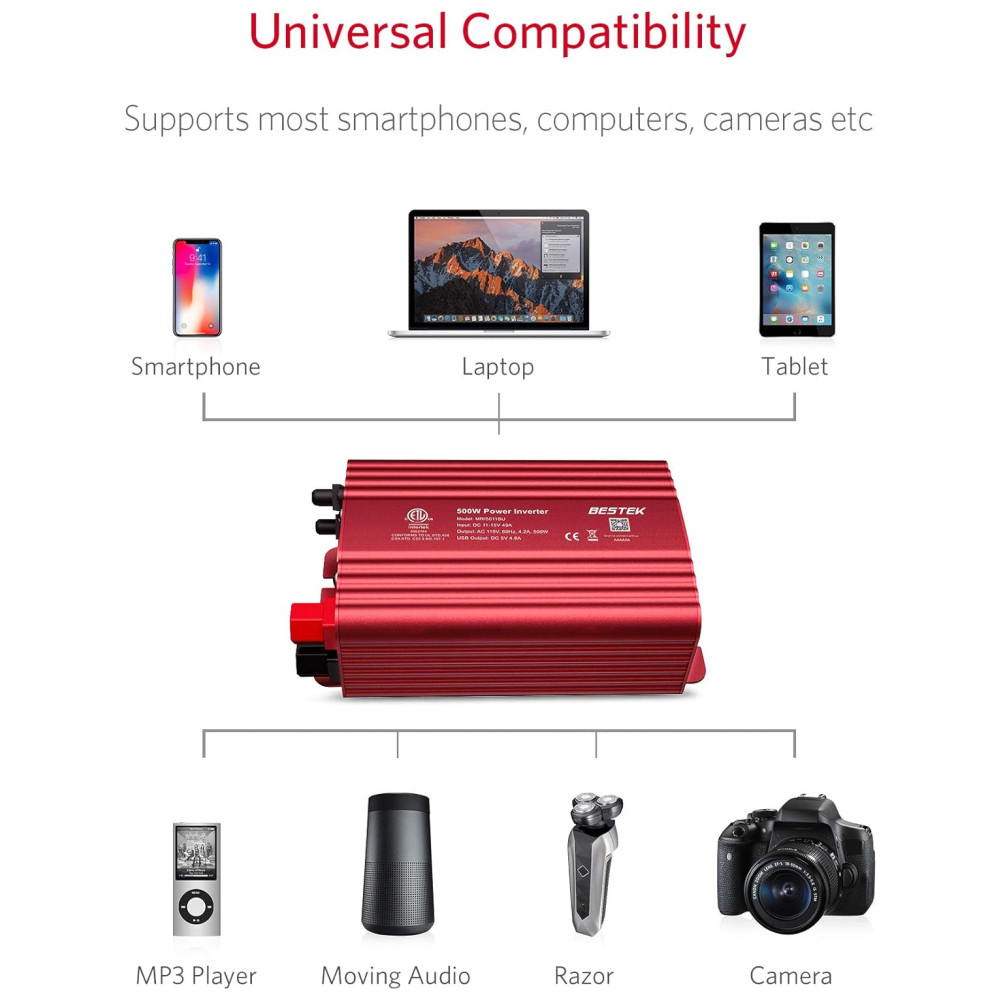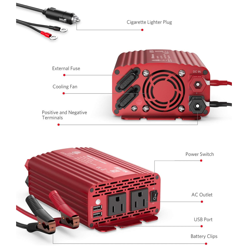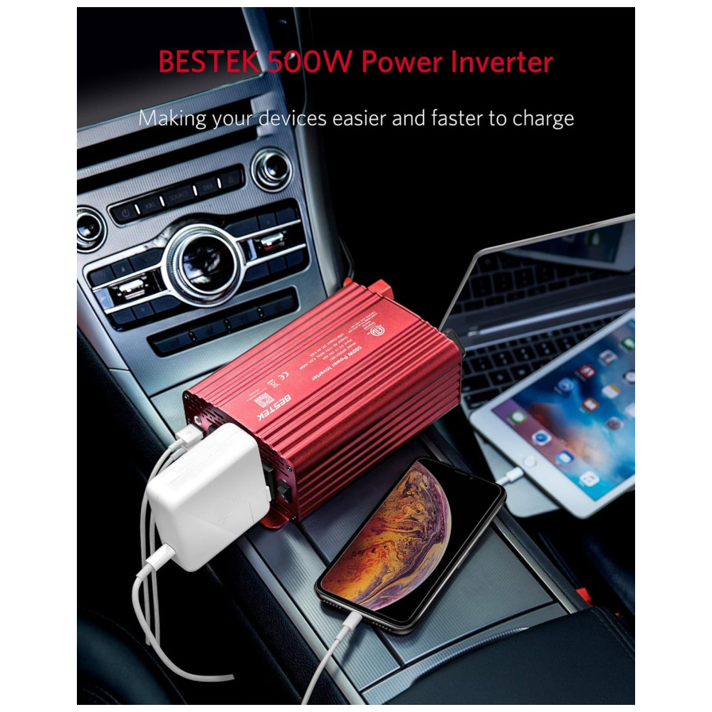 Inversor de potência BESTEK. Marca de inversor de potência n 1 da América. Fornece energia contínua de 500 W DC para CA e 1000 watts de potência de pico, com 2 tomadas CA e 2 portas de carregamento rápido USB. Carregamento poderoso. Tomadas duplas de 110V CA para alimentar dispositivos maiores, como laptops e tablets ou qualquer outro aparelho doméstico com menos de 500 watts, 2 portas USB inteligentes 0 2,4A para carregar dispositivos alimentados por USB. Uma boa opção para acampar, necessidades externas ou viagem de carro no caminho. 2 Fusíveis sobressalentes de 40A para proteger seu dispositivo e bateria. A tecnologia de carregamento fornece proteção contra superaquecimento, carregamento de sub , sobretensão, sobrecarga e curtos circuitos. Ventilador de refrigeração silencioso. O ventilador de refrigeração inteligente gira automaticamente em velocidade diferente de acordo com a carga de energia e a temperatura, este design pode ajudar a reduzir o ruído do ventilador. Além disso, o ventilador de alta velocidade protege o inversor contra superaquecimento. Vem com um plugue de isqueiro do carro e um par de grampos de bateria de jacaré , convenientes para conectar o isqueiro ou conectá lo à bateria de 12V, 2 peças de fusíveis 40A sobressalentes