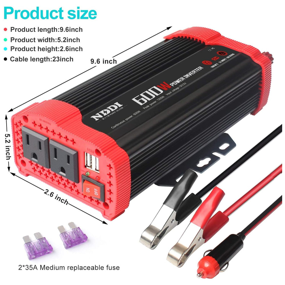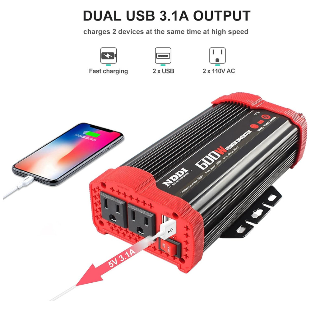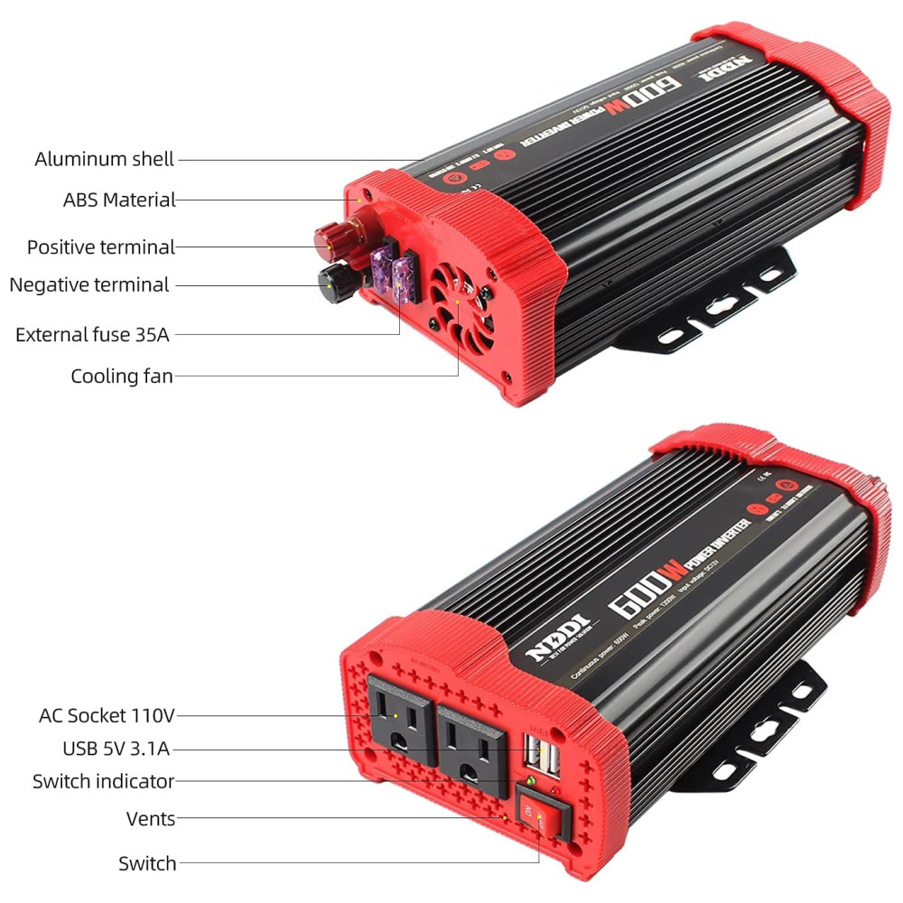 Inversor de Potência 600W 12V Para AC 2 Tomadas USB 110v NDDI Vermelho